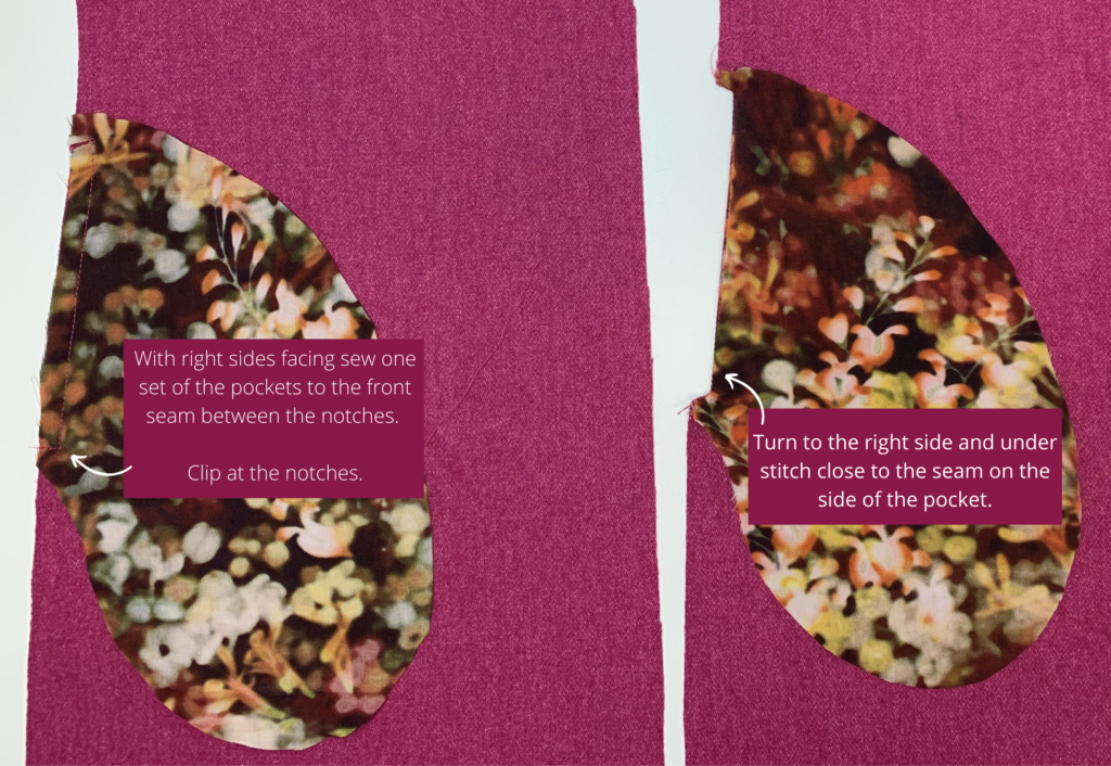 With right sides facing sew one set of the pockets to the front seam as marked on the pattern (A), clip at the notches, turn to the right side and under stitch close to the seam on the side of the pocket.