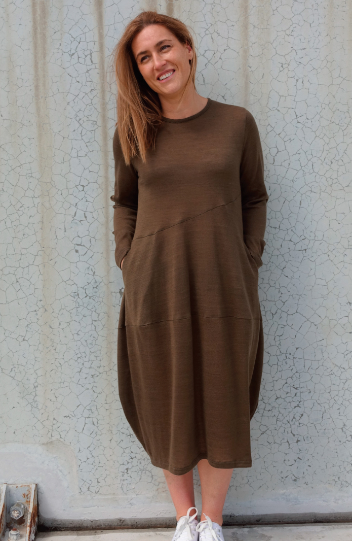 It is fair to say that we have a slight obsession with the cocoon silhouette here at Style Arc HQ. Just when you thought we were done with cocoons we bring out a new twist on this shape and we are excited to share this one with you! Our latest pattern release the Venice Knit Dress features a new pocket and some lovely design lines that complement the body nicely.