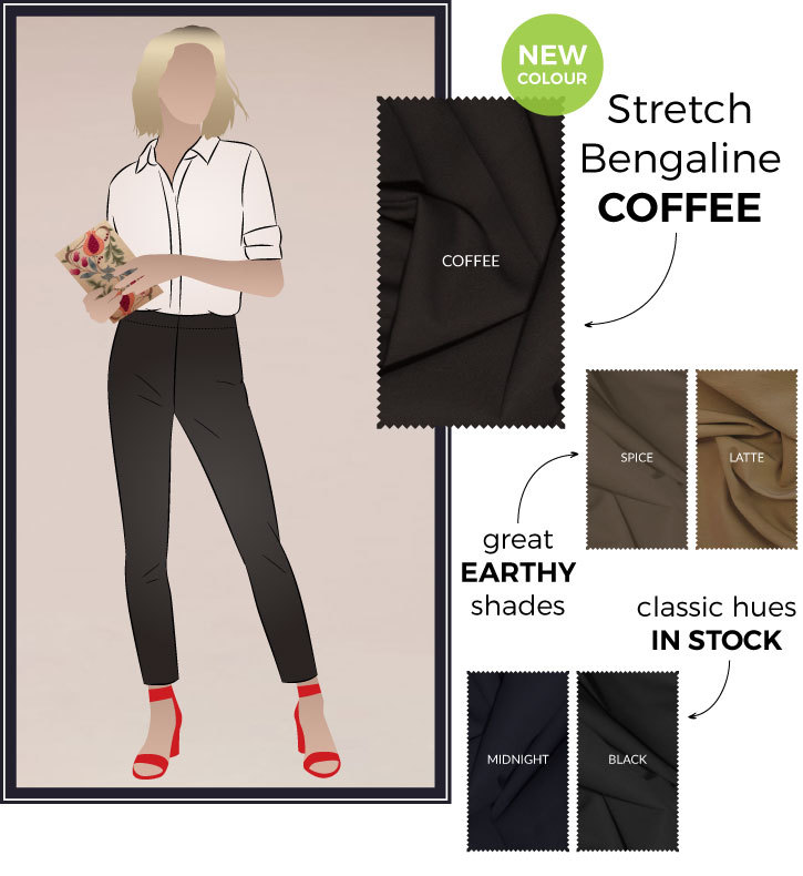 You can buy our fabrics separately too. Stocks for coffee and spice bengaline are limited, so don’t miss out. We can’t get enough of the amazing bengaline fabric. It has enough stretch for you to make a comfortable pull-on pant, but with a gorgeous tailored look.