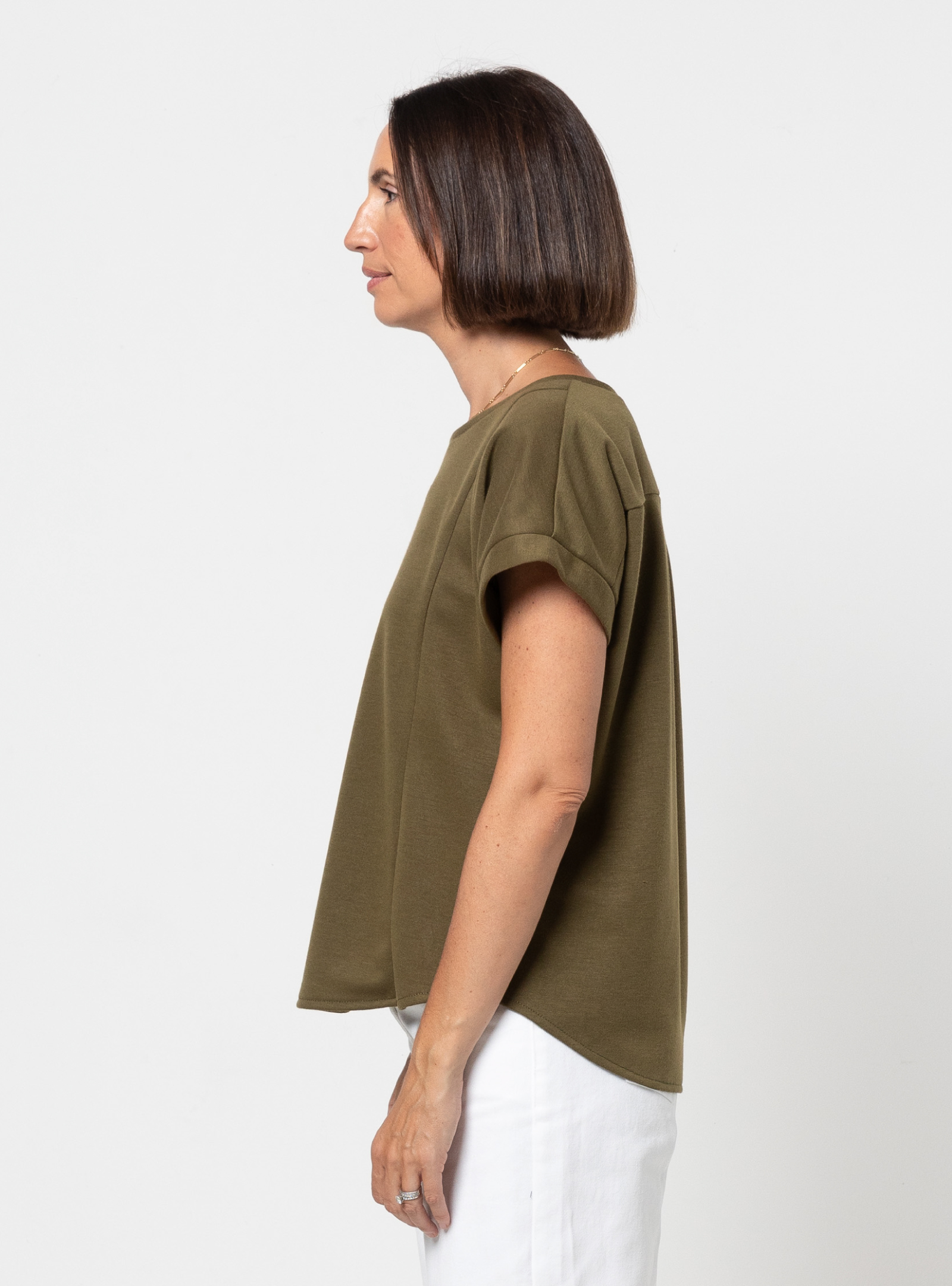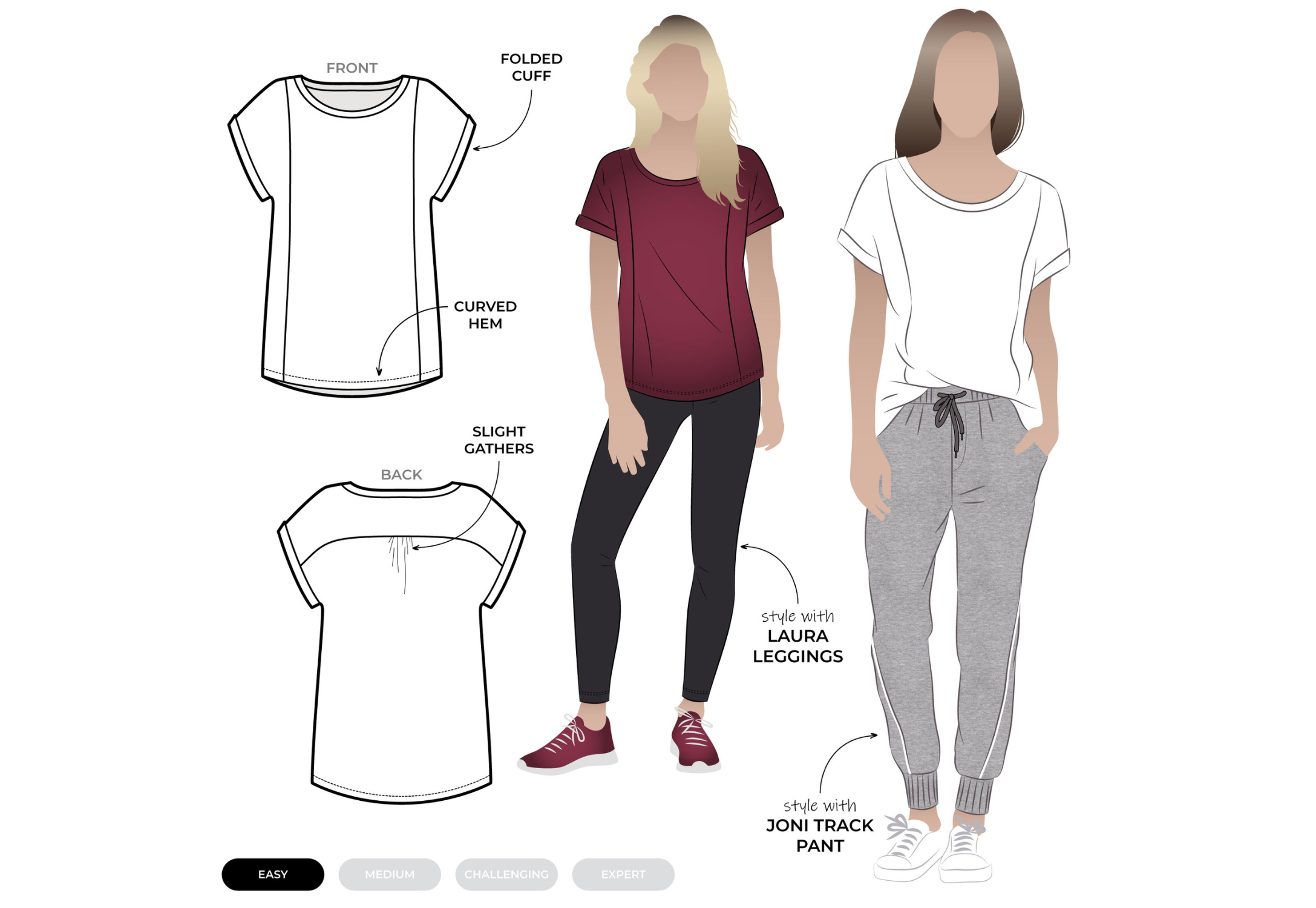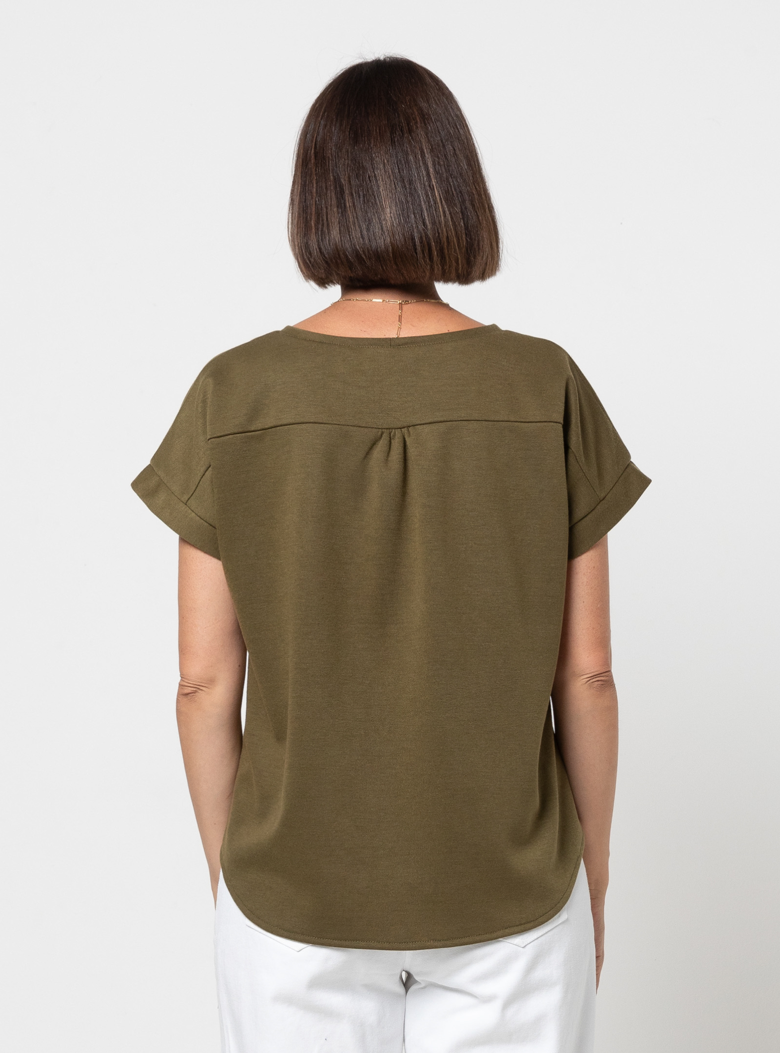 A well-drafted pattern that is easy to read, understand and assemble. The shape of the top is a classic easy-fitting t-shirt, while the little details such as the gather on the back yoke, front style lines and sleeve cuff elevate the top to more fashionable heights. Can be made up in knits and wovens – a staple item!