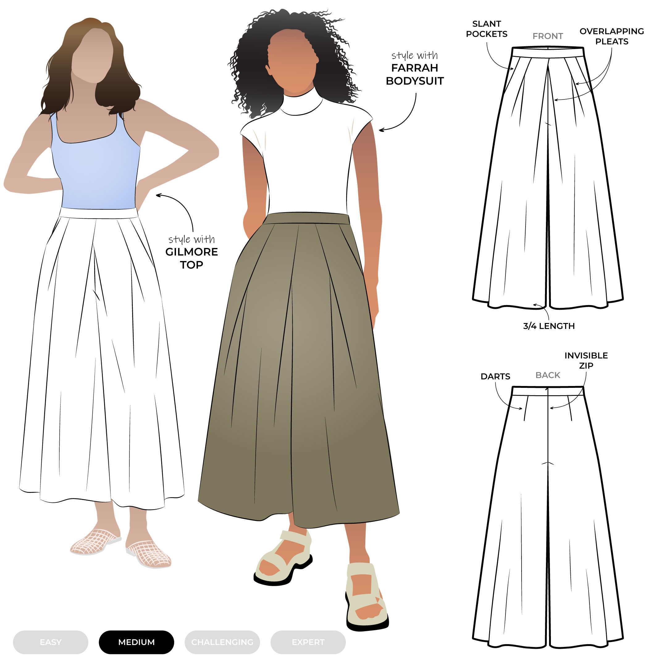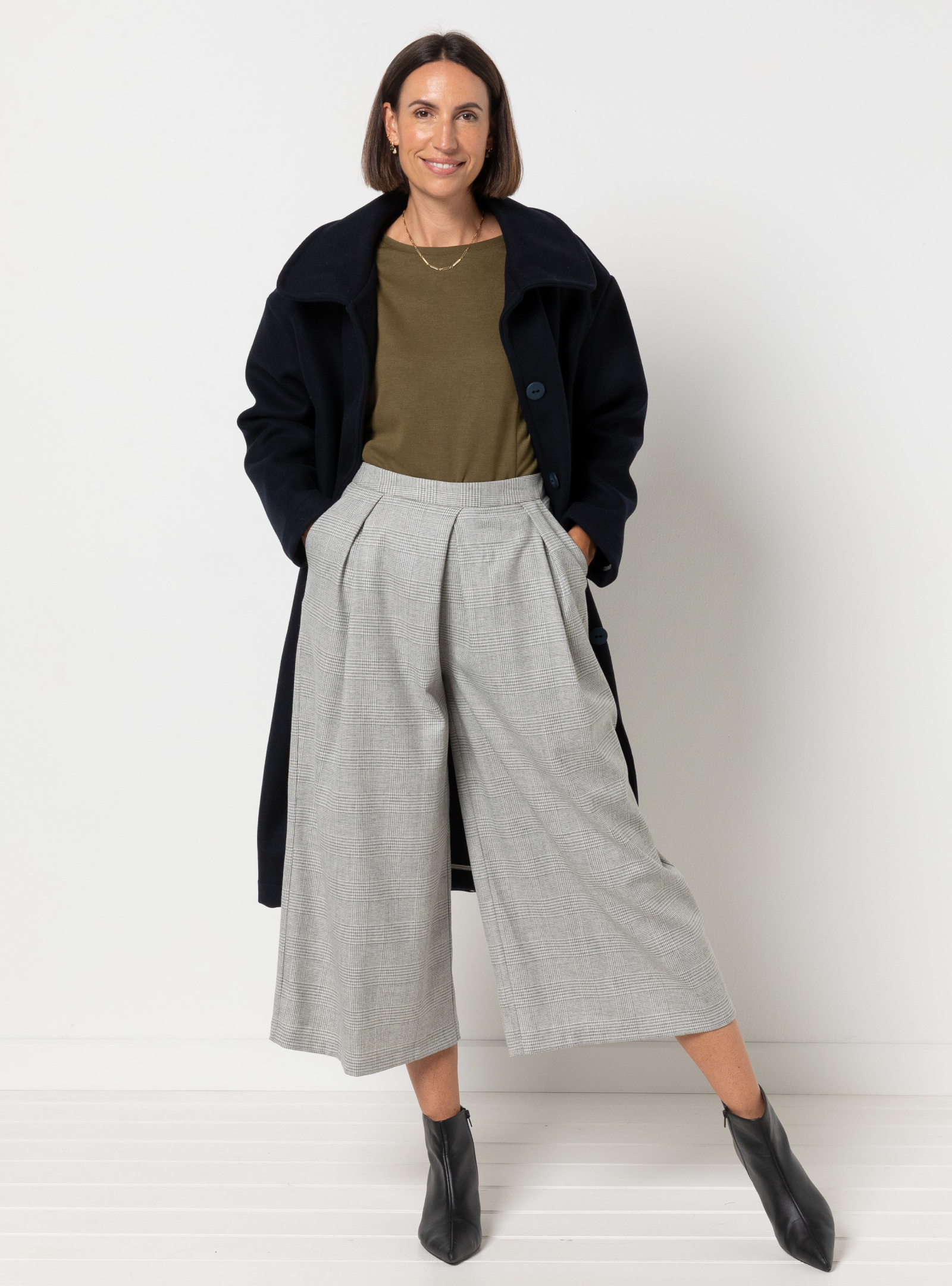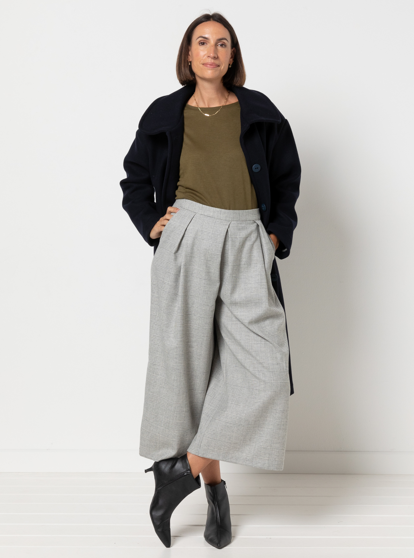 The Erin Woven Culotte sewing pattern features a fitted waistband that sits at the low waist, with angled front pleats that flow into the slant pockets to create an eye-catching design detail. Back waist darts, a wide-leg silhouette and three-quarter length deliver a sophisticated look, while the invisible centre back zip ensures a beautifully tailored, boutique-quality finish.