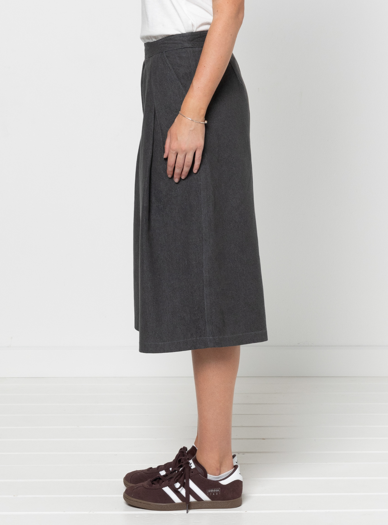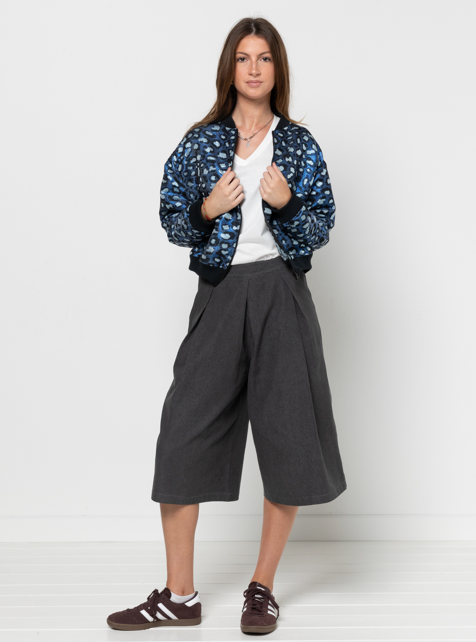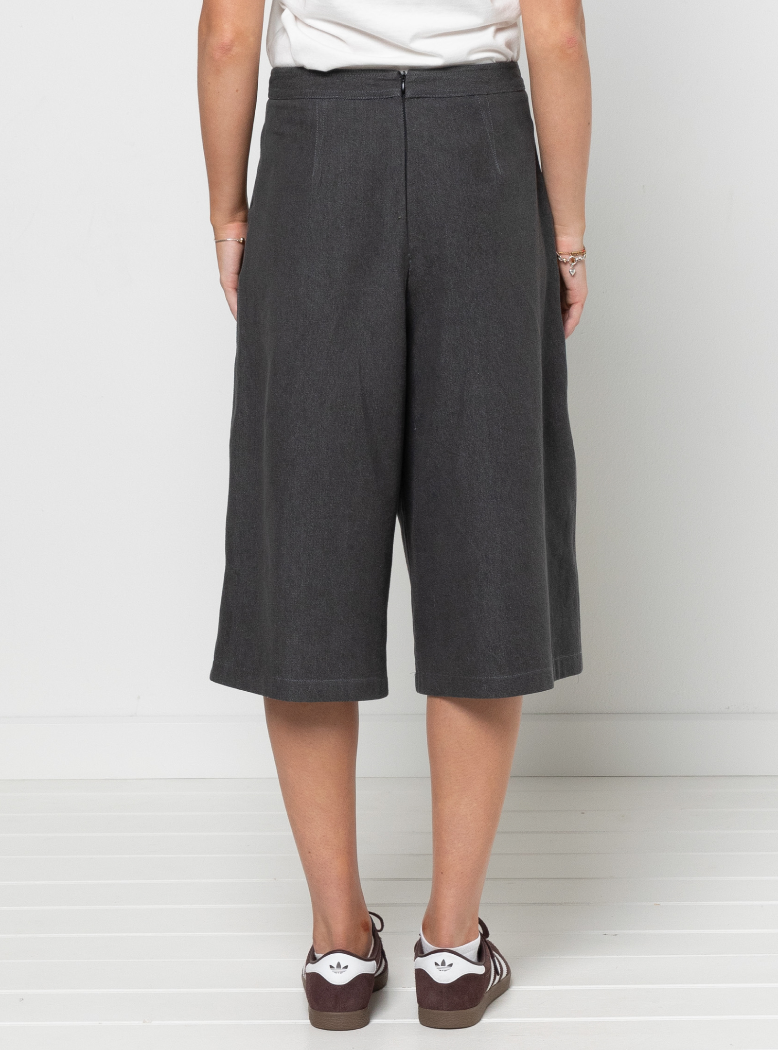 The Erin Woven Culotte sewing pattern features a fitted waistband that sits at the low waist, with angled front pleats that flow into the slant pockets to create an eye-catching design detail. Back waist darts, a wide-leg silhouette and three-quarter length deliver a sophisticated look, while the invisible centre back zip ensures a beautifully tailored, boutique-quality finish.