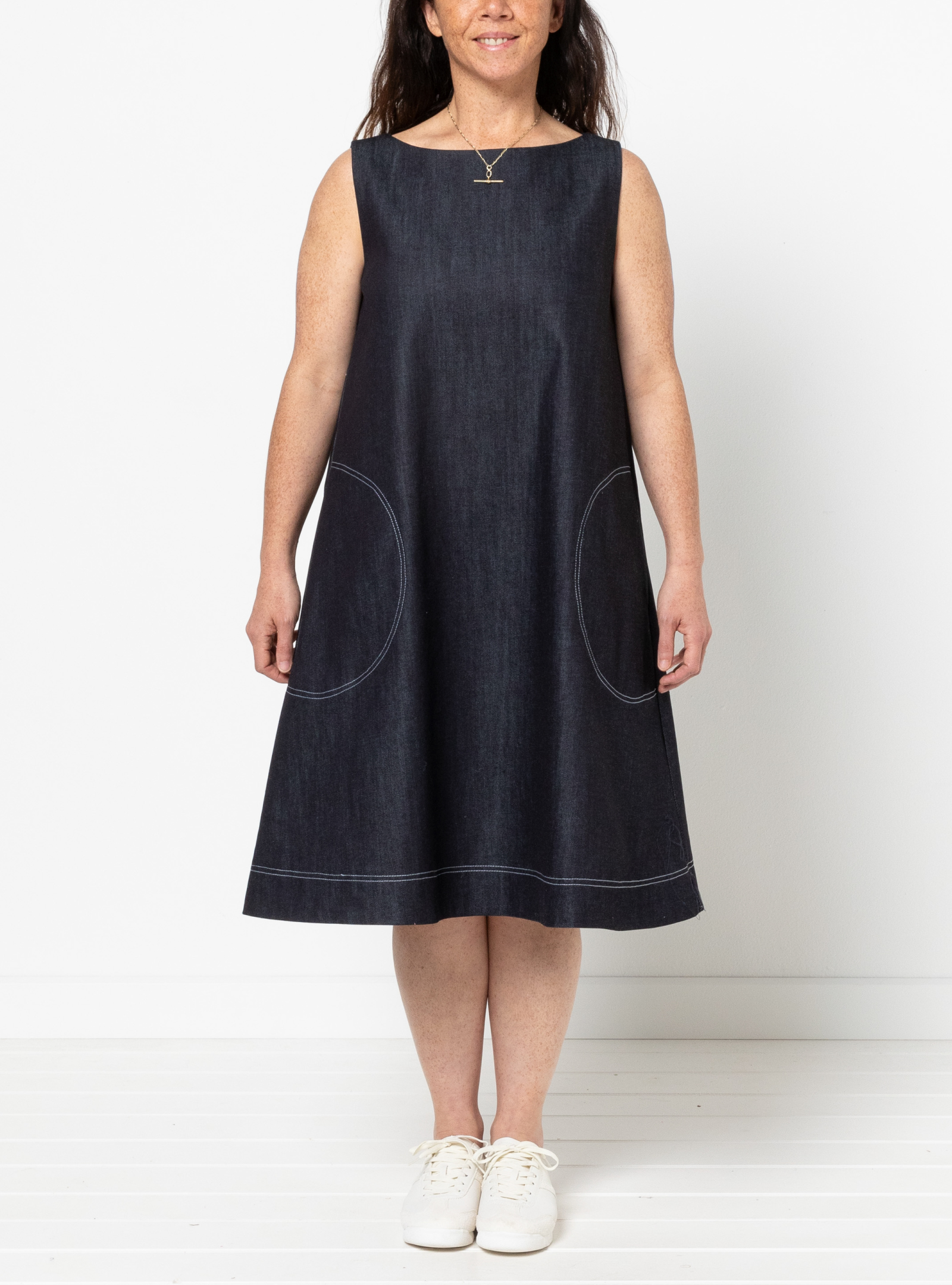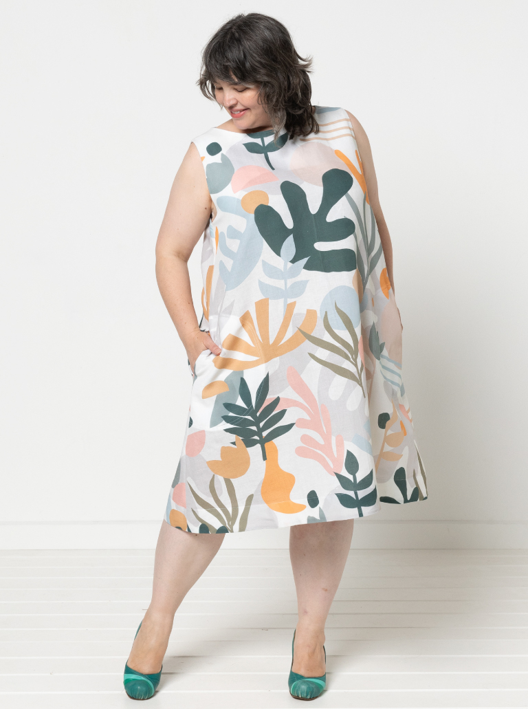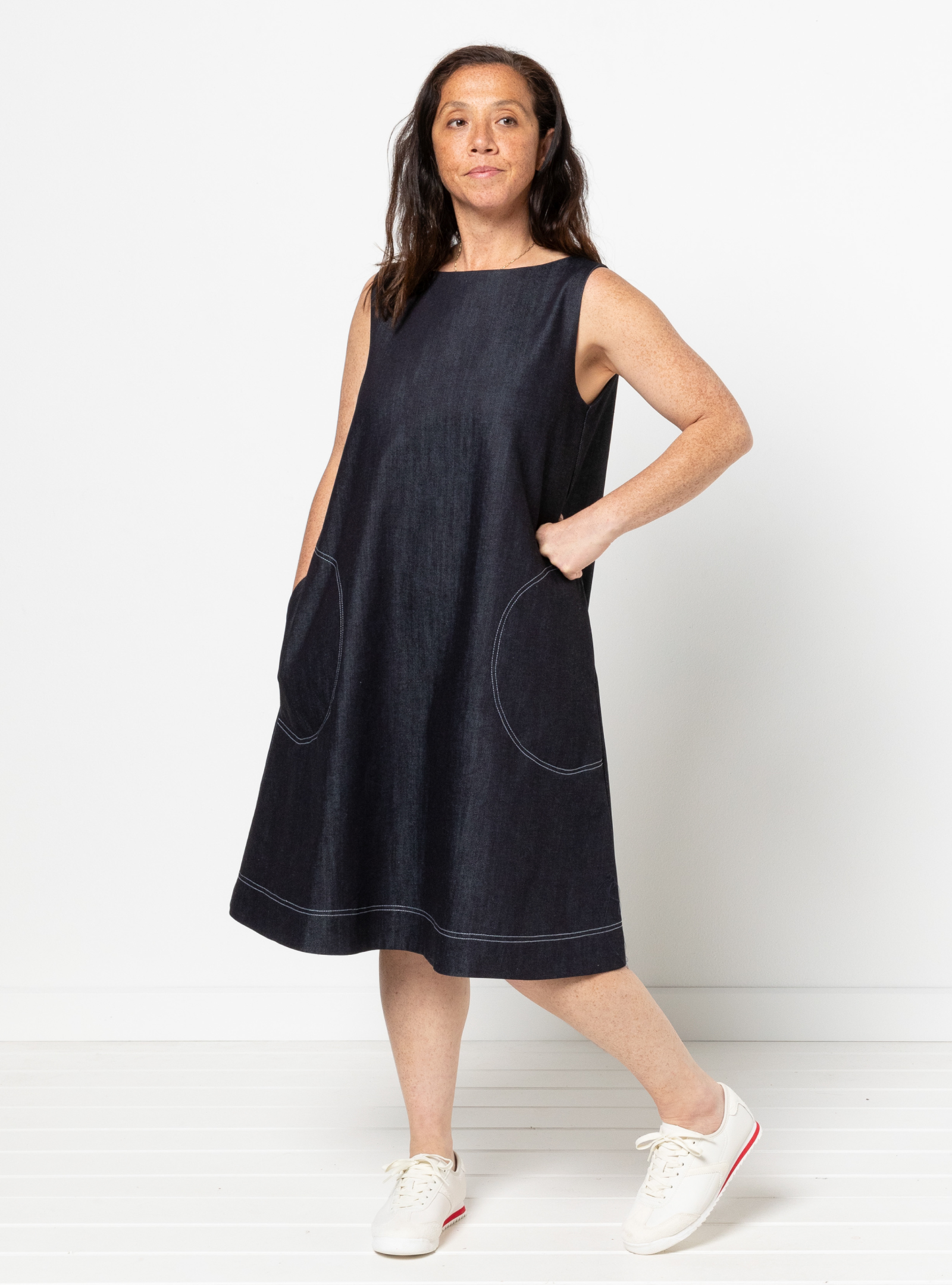 The Lena Shift Dress sewing pattern showcases a relaxed trapeze shape with a clean boat neck and sleeveless design. Finished with an all-in-one facing, large inseam pockets, and subtle top stitching, the calf-length silhouette offers a modern, practical style that’s perfect for everyday wear.