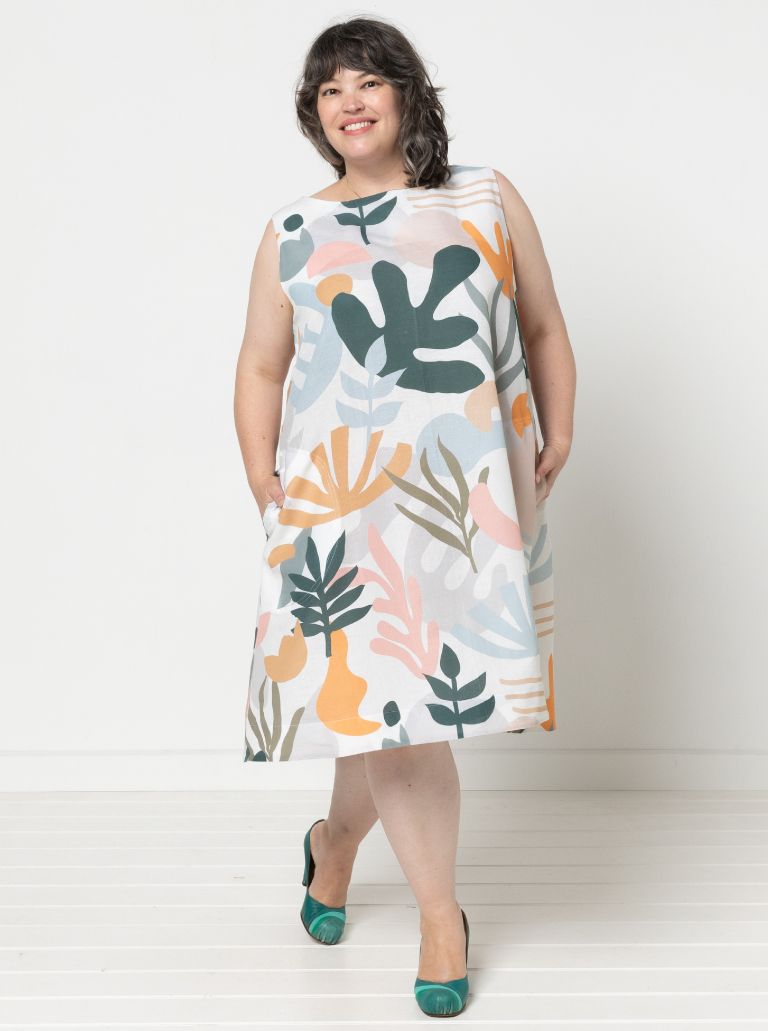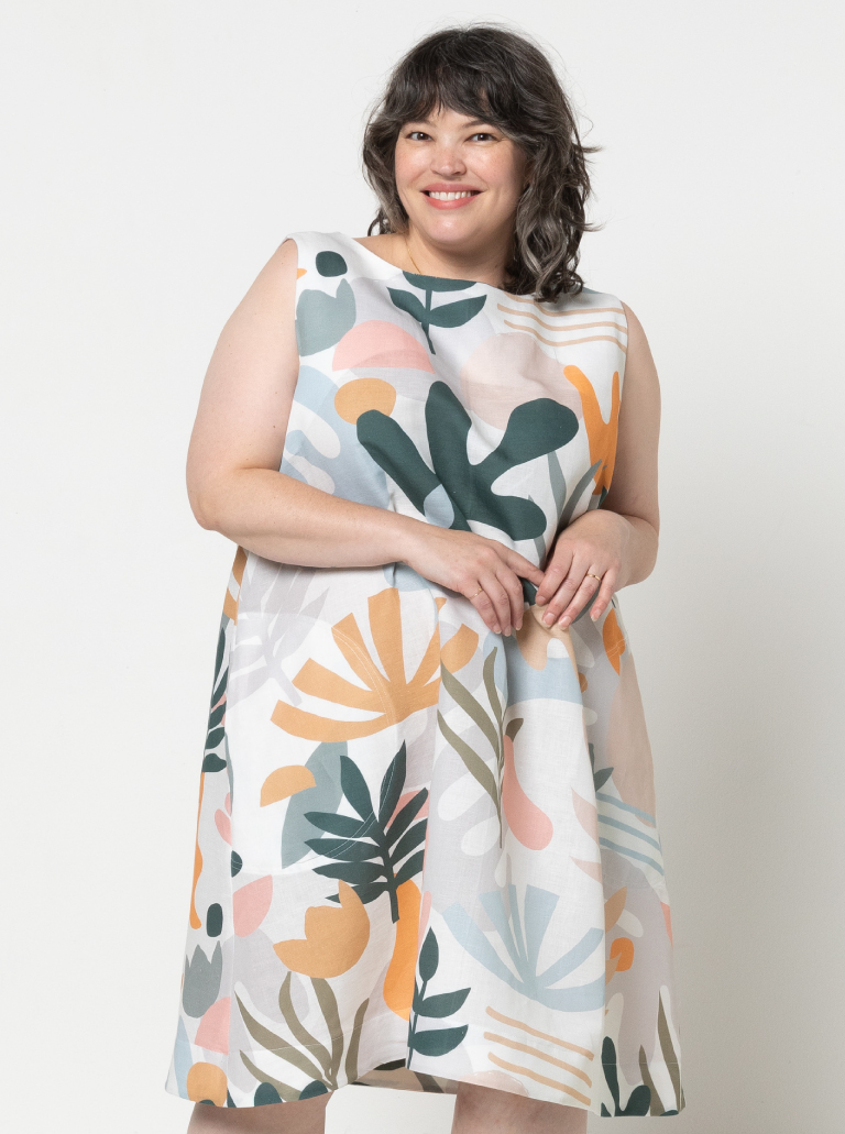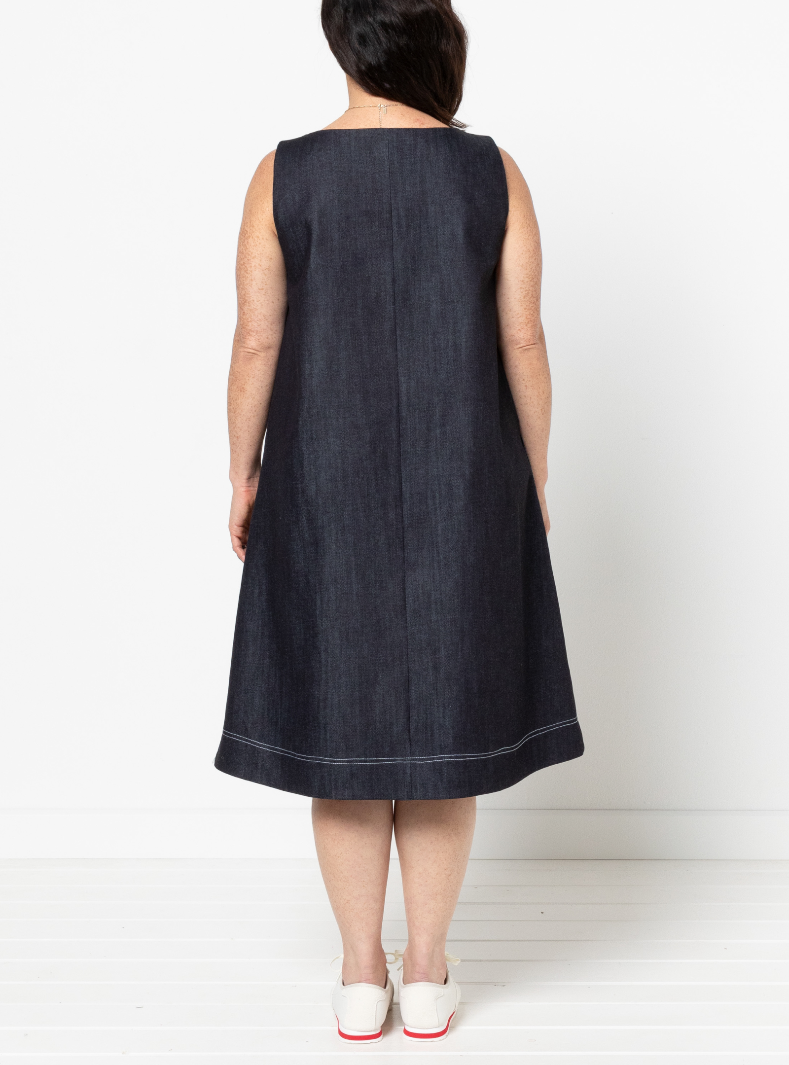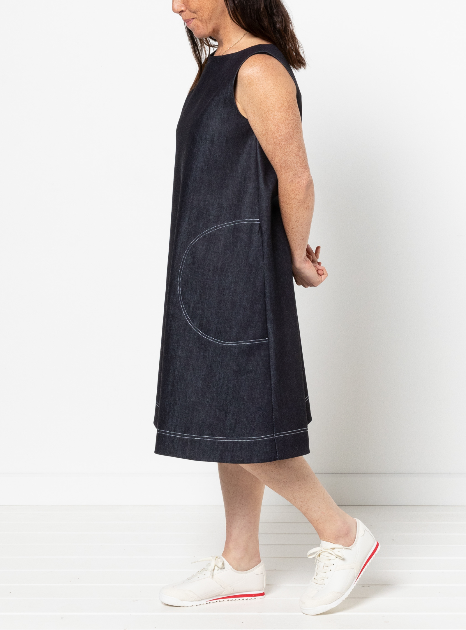 The Lena Shift Dress sewing pattern showcases a relaxed trapeze shape with a clean boat neck and sleeveless design. Finished with an all-in-one facing, large inseam pockets, and subtle top stitching, the calf-length silhouette offers a modern, practical style that’s perfect for everyday wear.