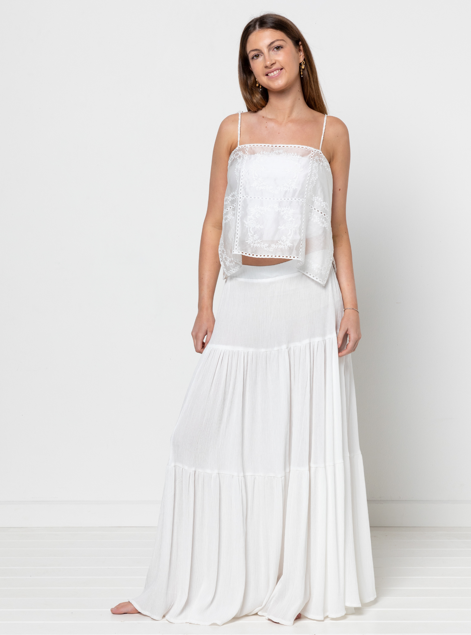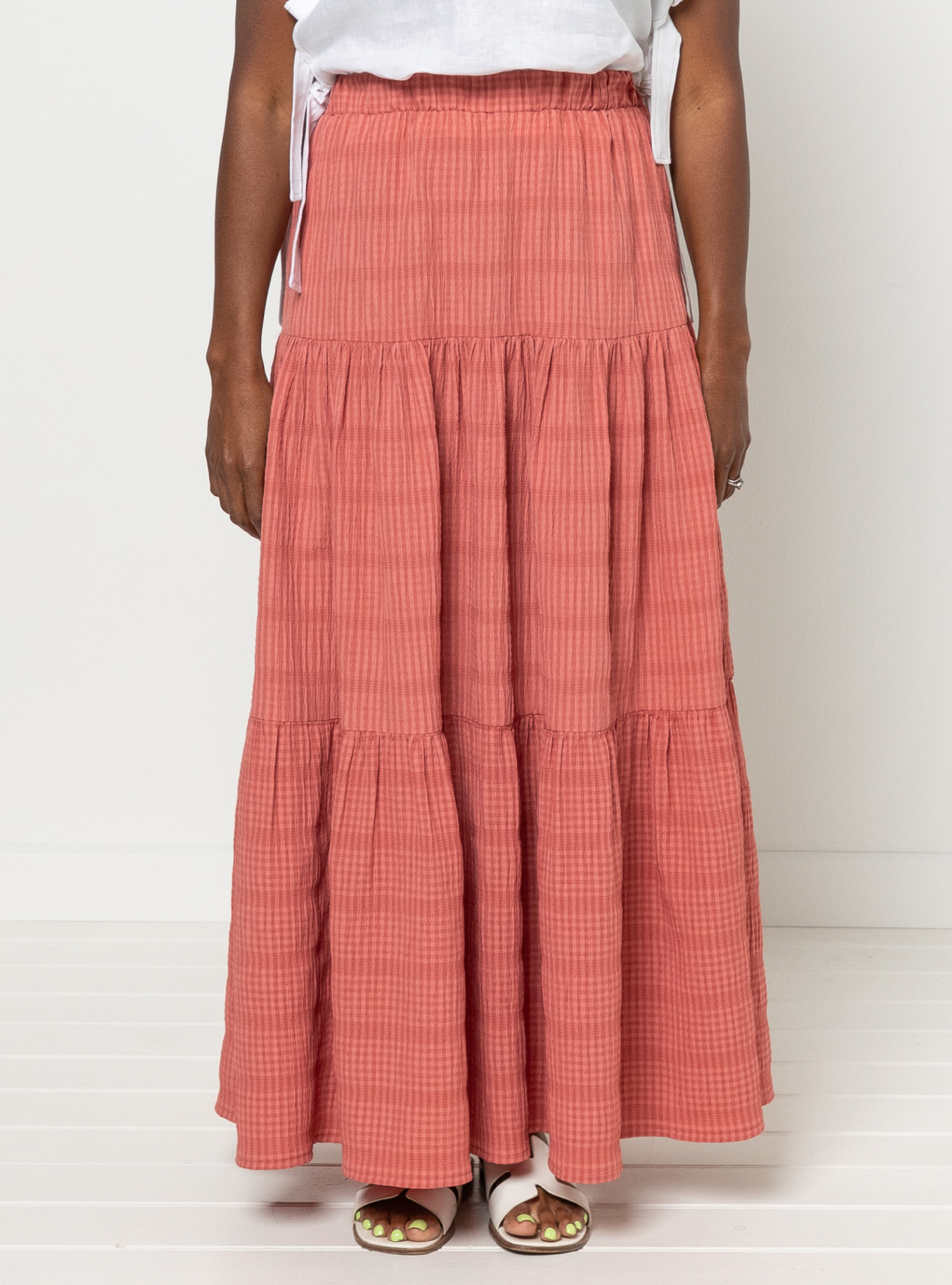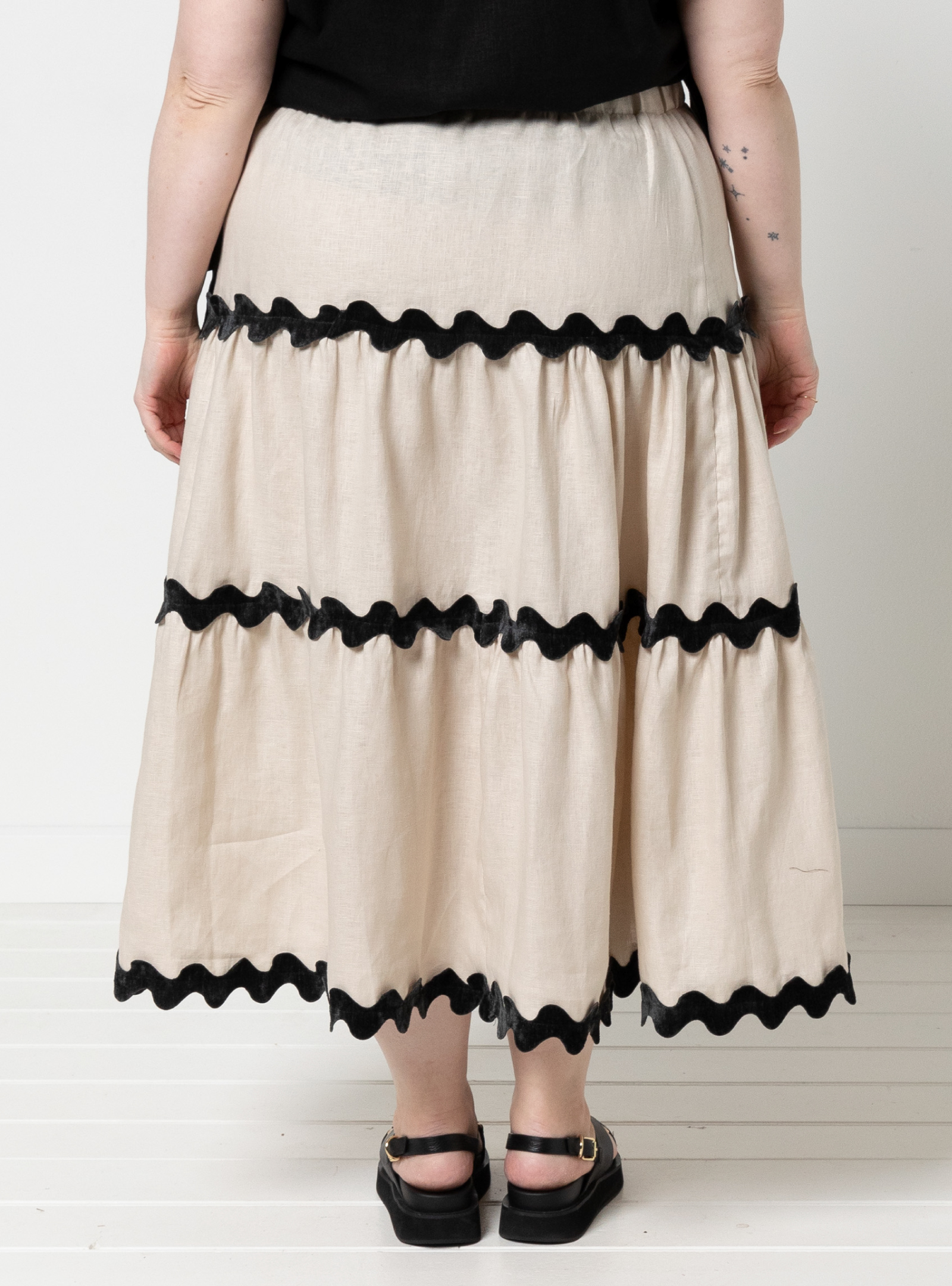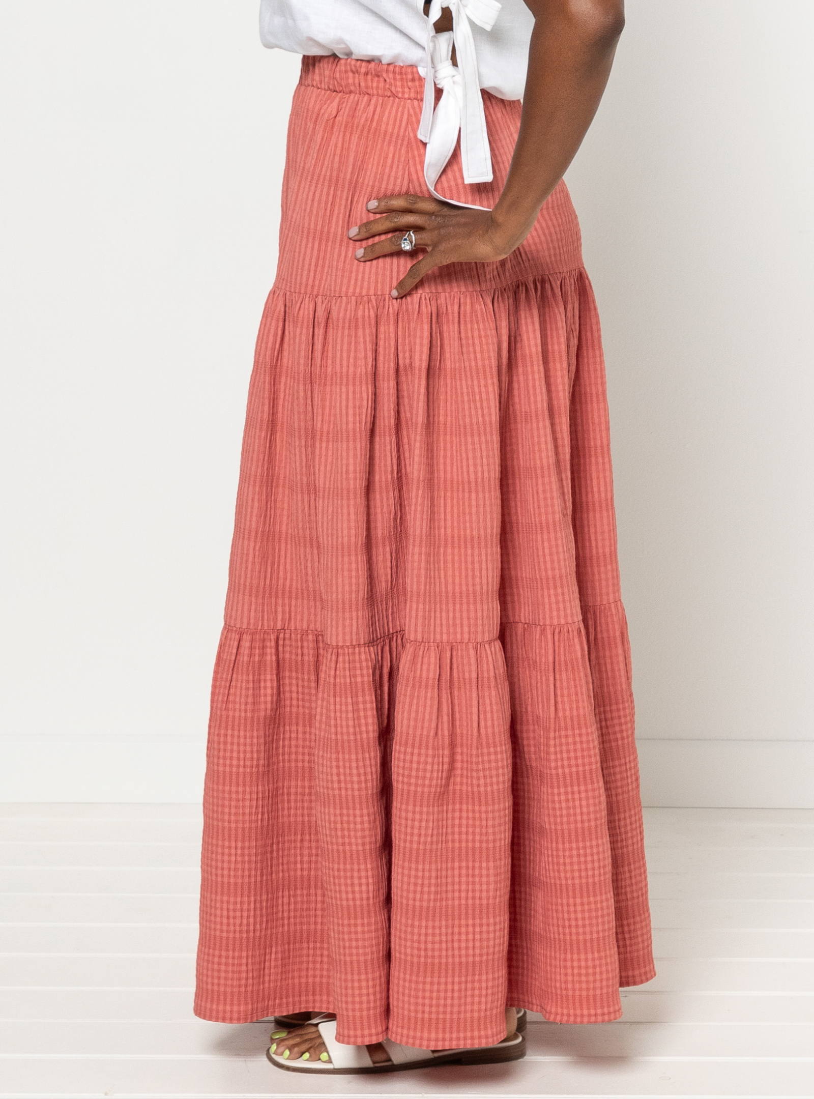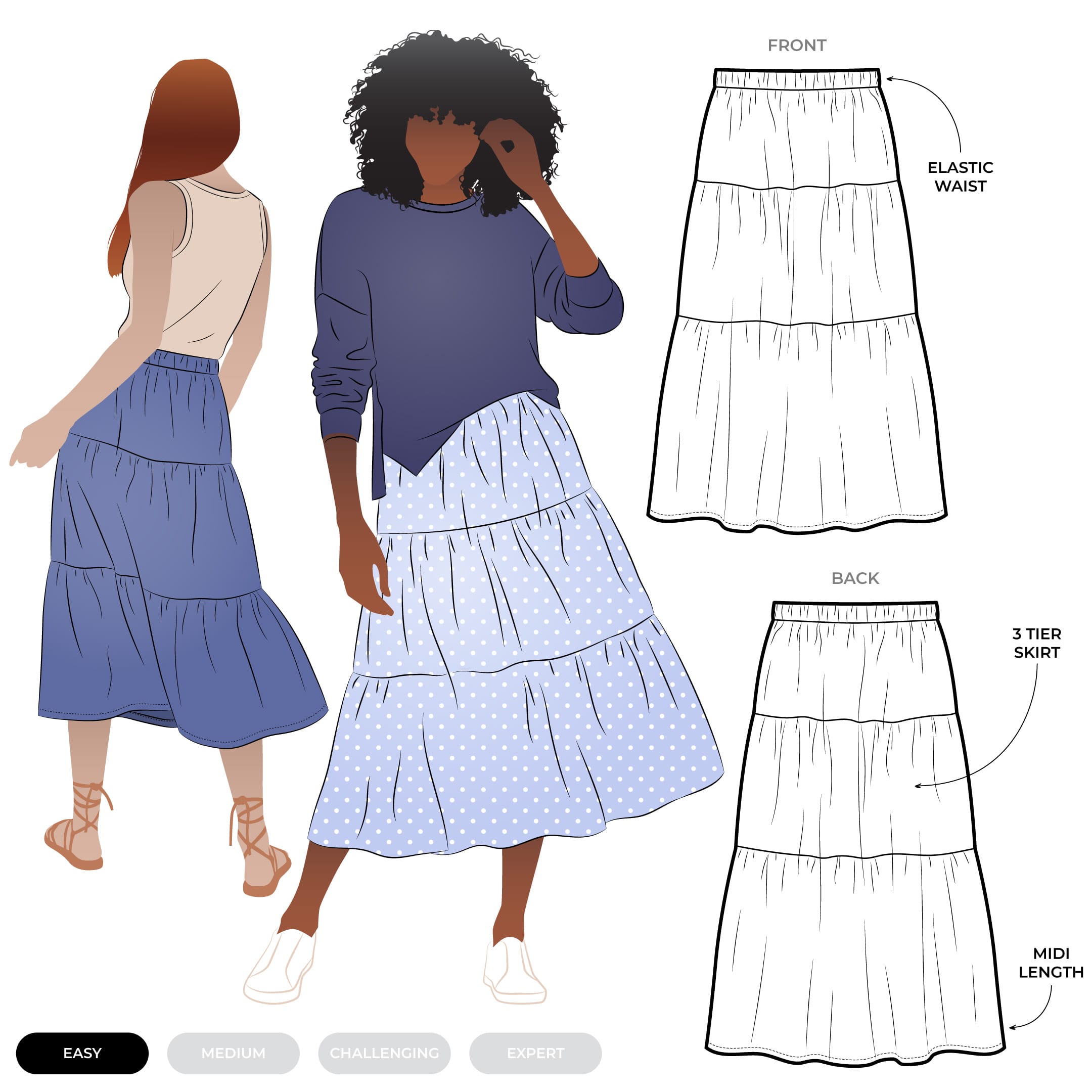 This is an amazing skirt. I have made this in two sizes and it is EASY, but looks great. Both of my daughters wanted spring & summer skirts so I made a variety in challis & cotton voile. For the first, I put it together the way I was taught: assembling the top tier to the second tier to the third tier; then adding the waistband, inserting the elastic and finally, heming. I did do French seams on the voiles. Then I decided that I could assemble things faster if I changed things up a bit. So for all the other skirts, I sewed the waistband to the top layer and inserted the elastic. Then I sewed the side seam on Tier 3 & put in the hem. Then I sewed the Tier 2 side seams & attached Tier 2 to Tier 3. Finally, I sewed Tier 1 to Tier 2 & the skirts were finished.