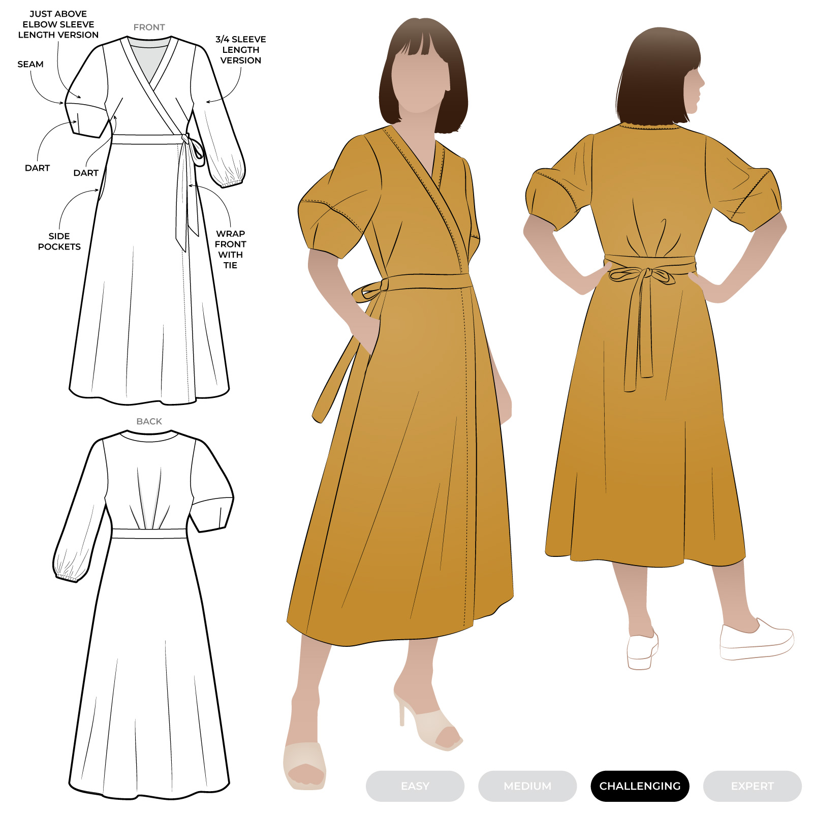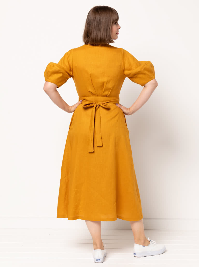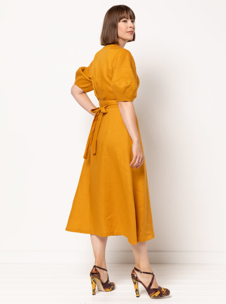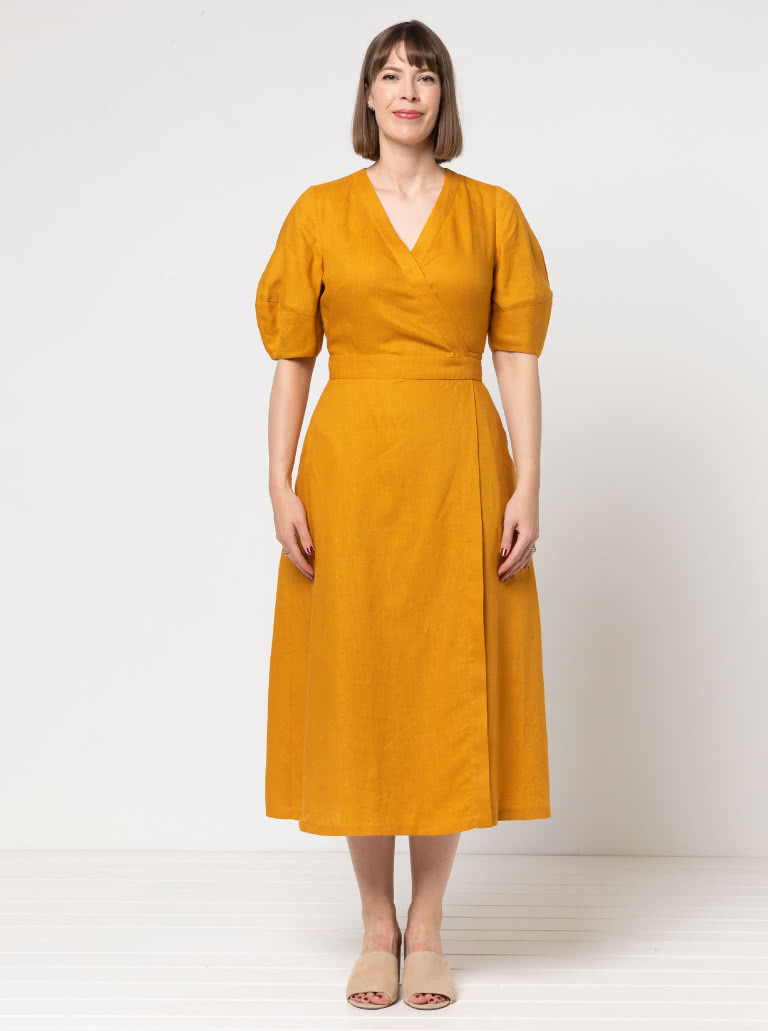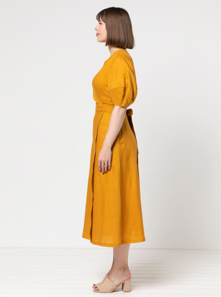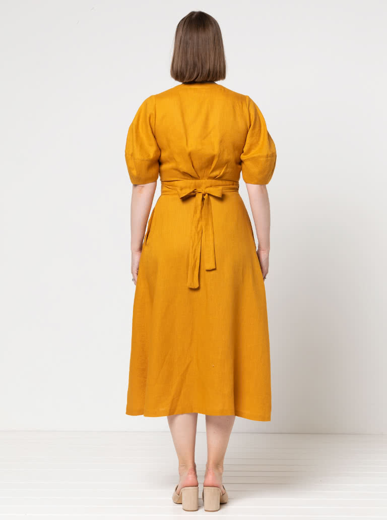 The Millicent Wrap Dress sewing pattern features a beautifully designed wrap bodice and skirt, with an elegant long length and three-quarter skirt wrap. The tie closure, along with defined neck and waist bands, creates a refined, adjustable fit, while bust darts and delicate back bodice tuck details add lovely shaping. With two sleeve options included, this versatile pattern will create a timeless wrap dress that feels both sophisticated and effortlessly wearable.
