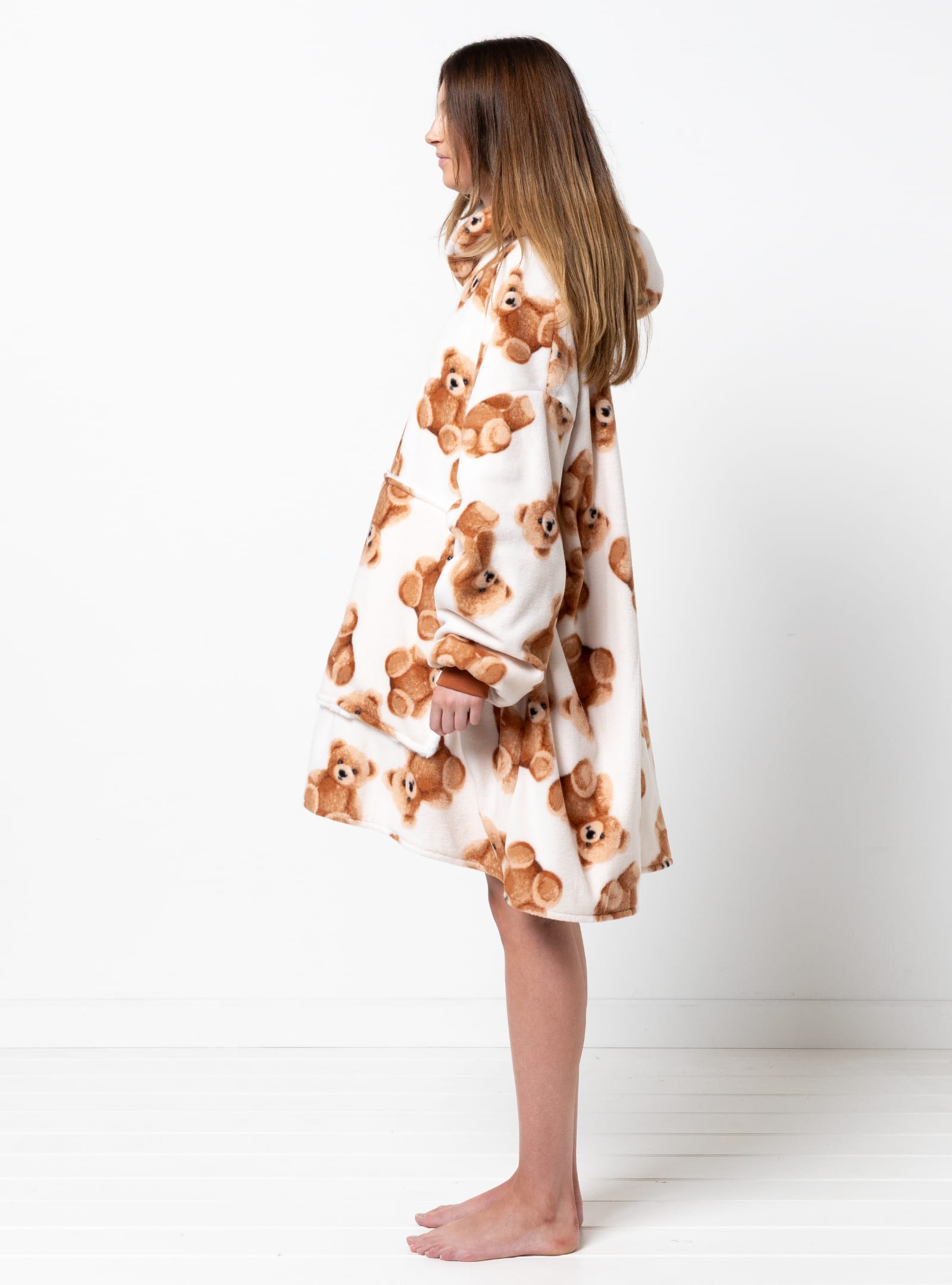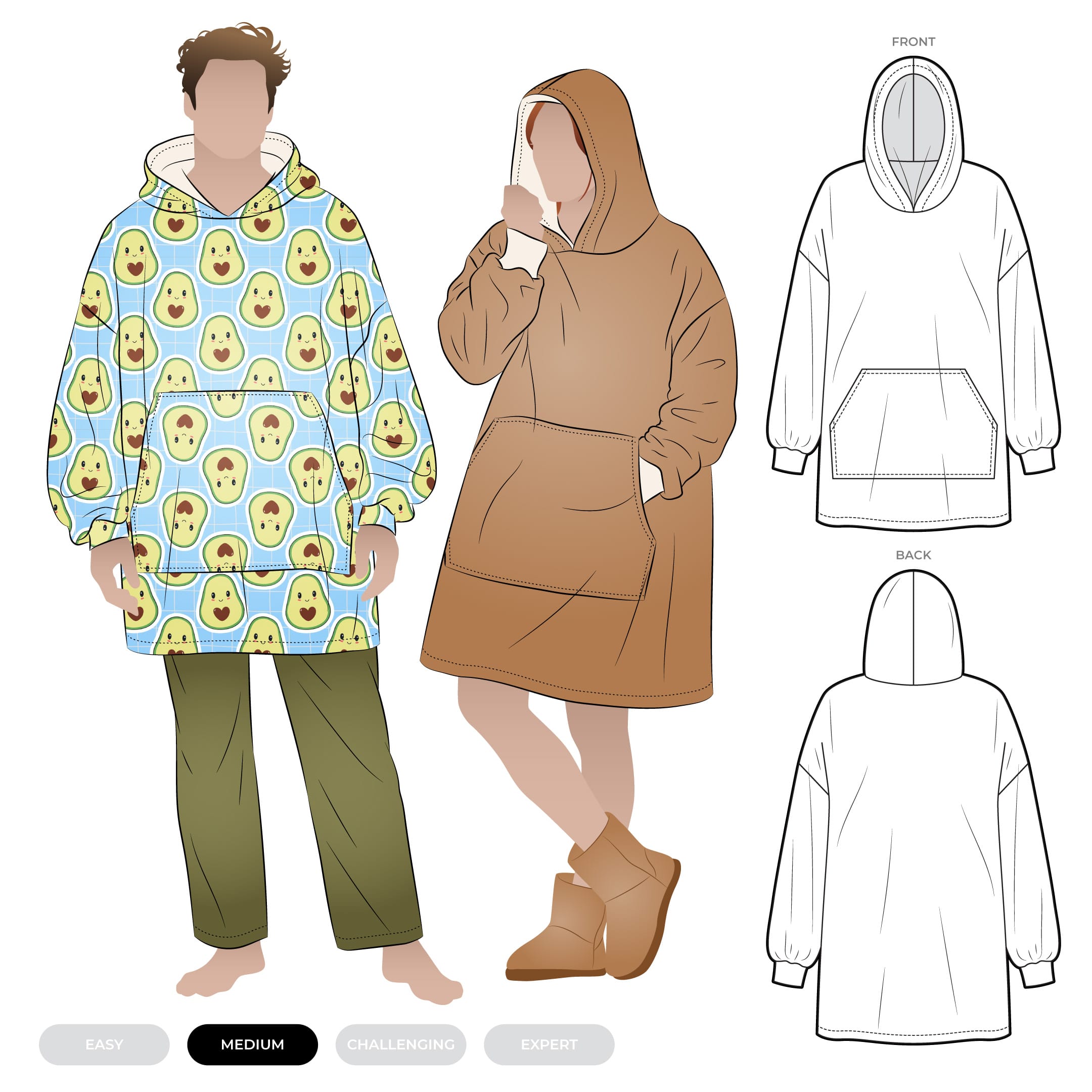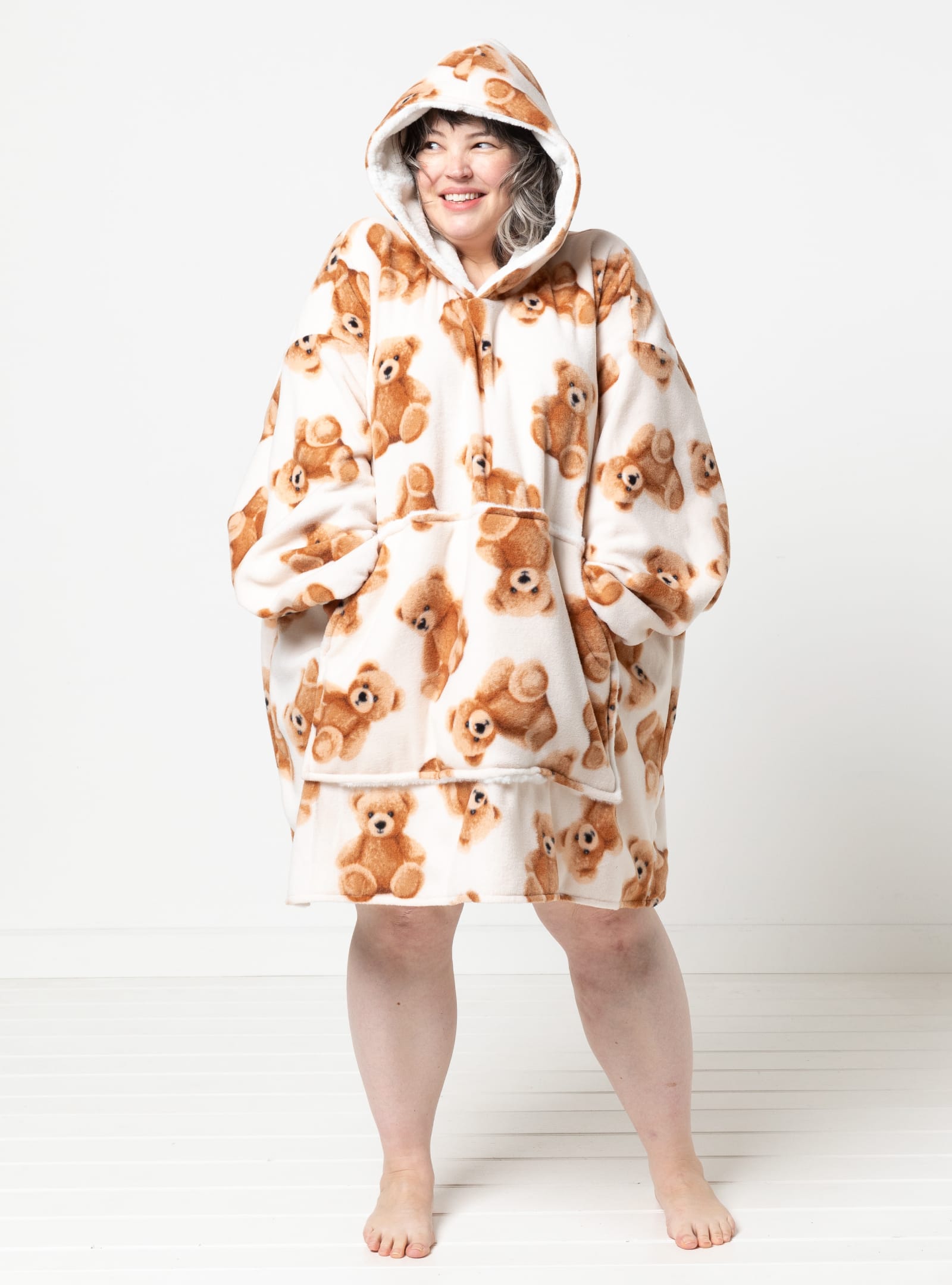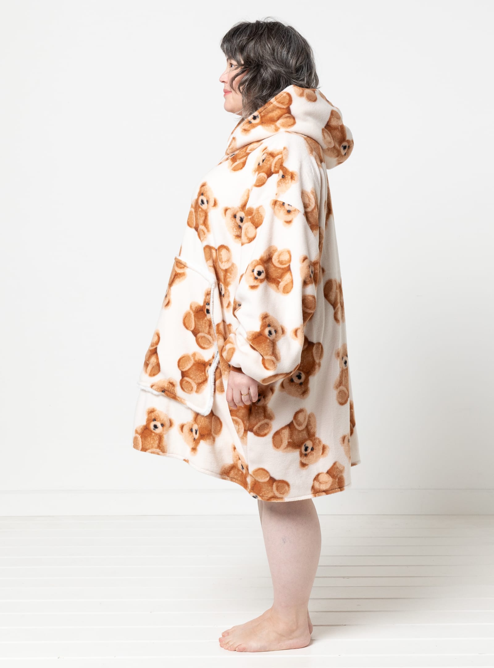The Weekend Hoodie sewing pattern is an oversized hoodie-style wearable blanket with a lined hood and pocket, ribbed cuffs, and an unlined body for an easy make.