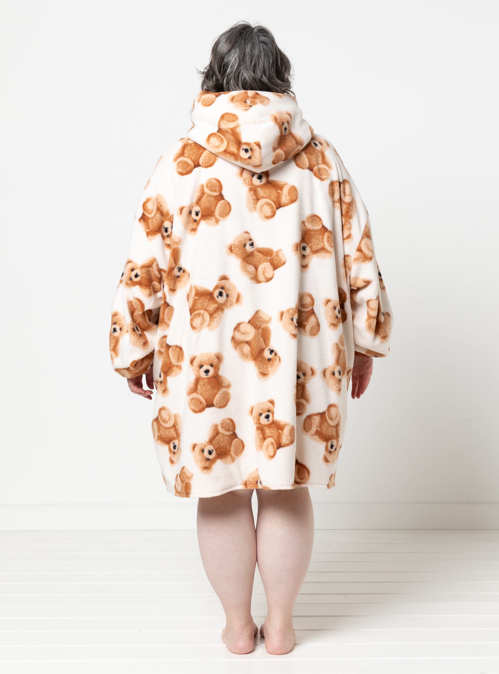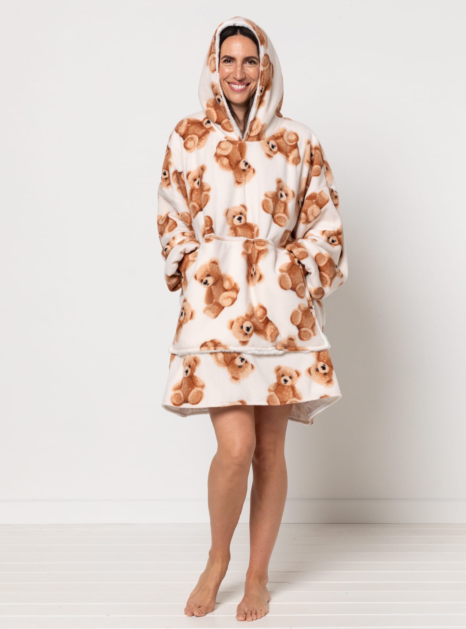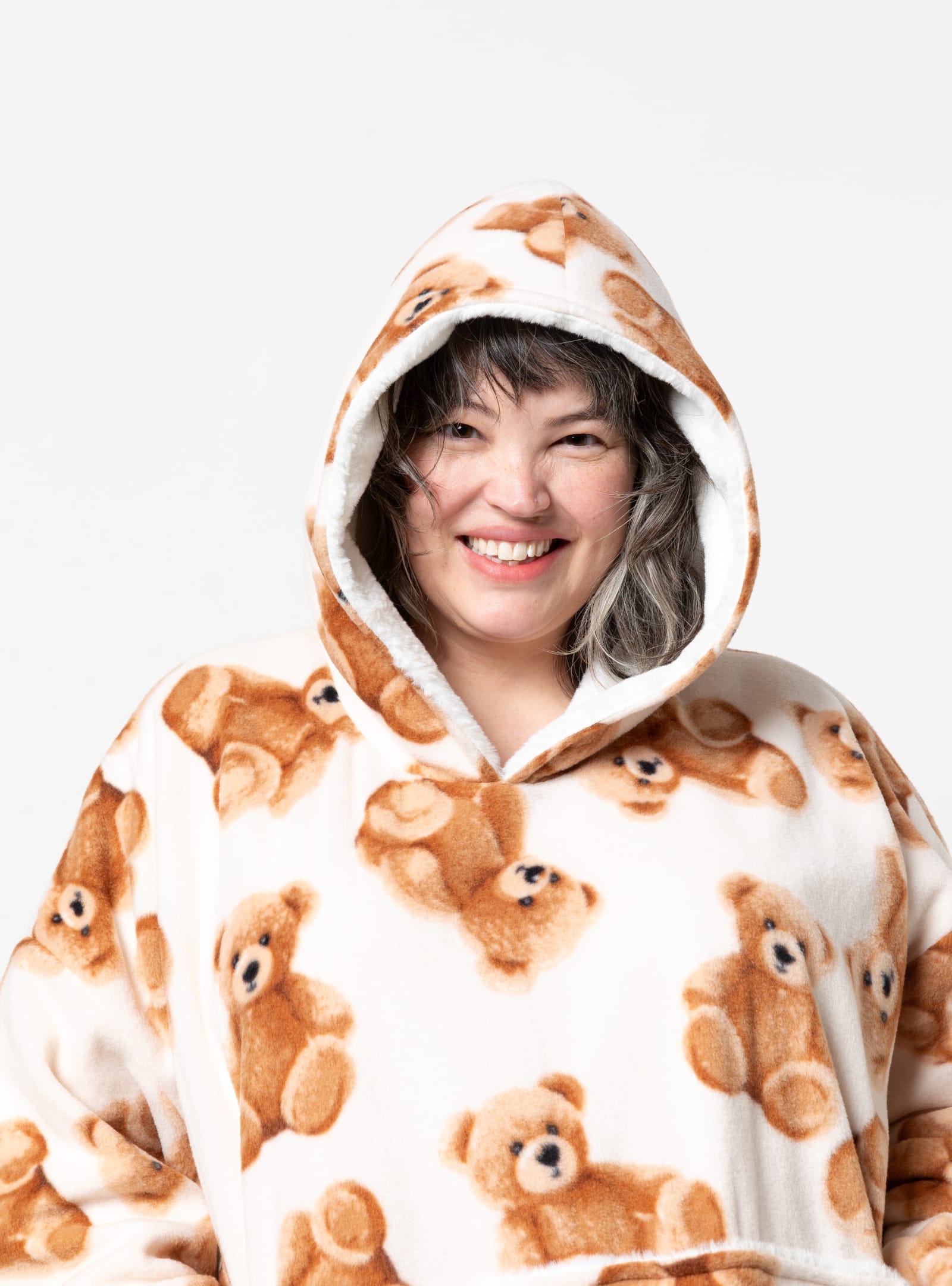 The Weekend Hoodie sewing pattern is an oversized hoodie-style wearable blanket with a lined hood and pocket, ribbed cuffs, and an unlined body for an easy make.