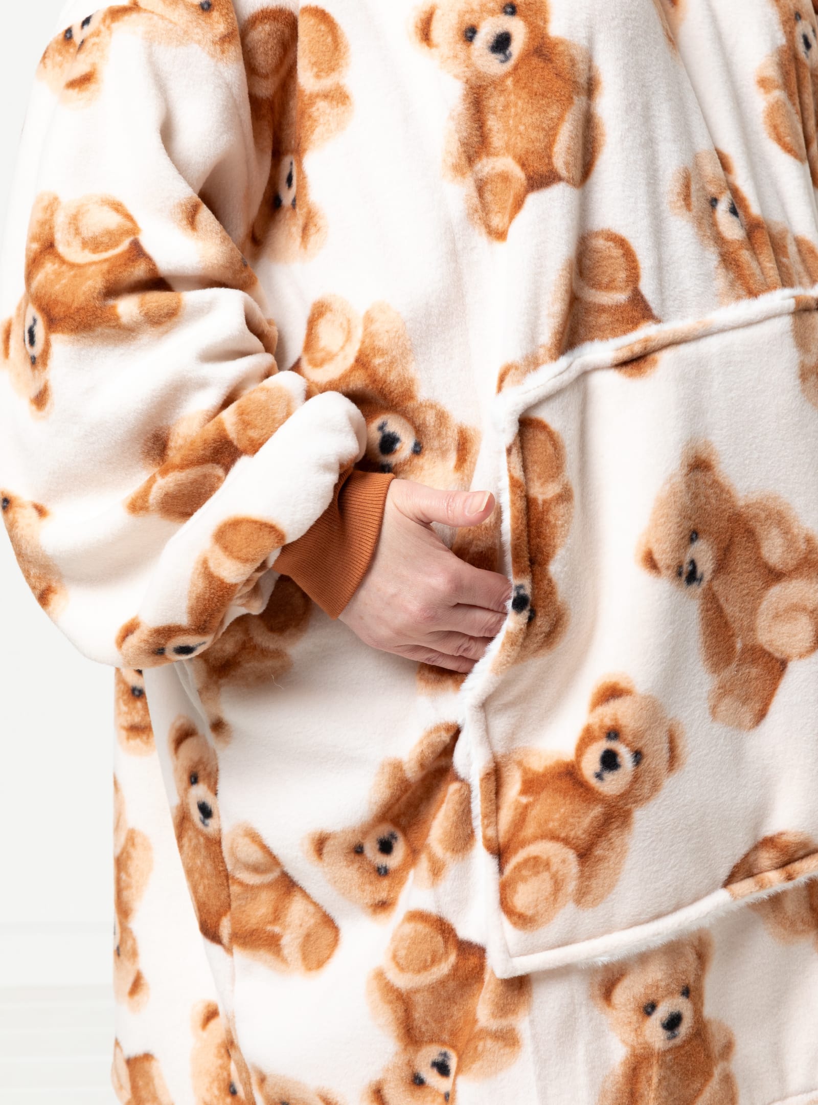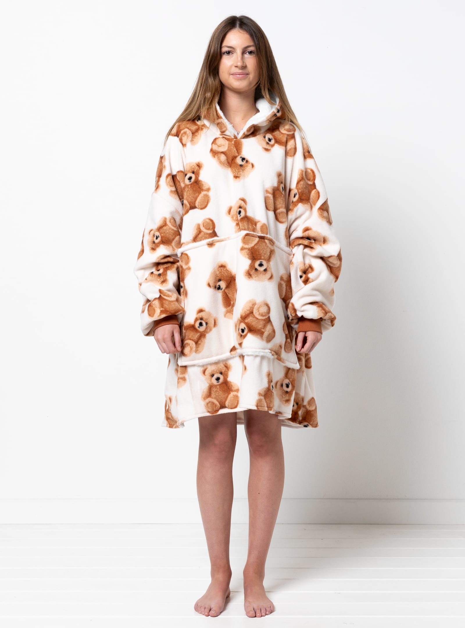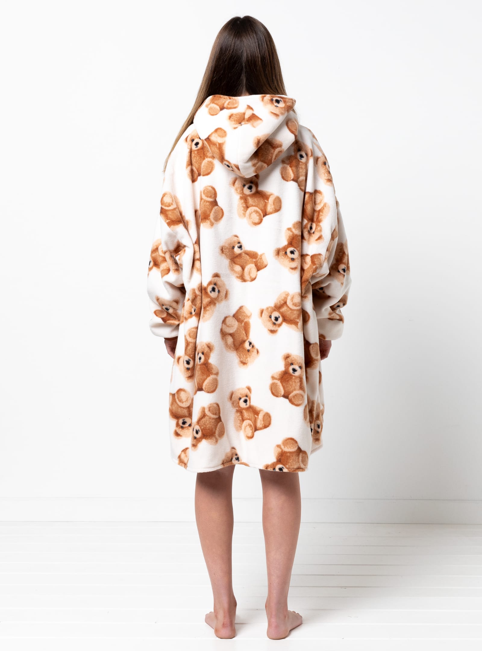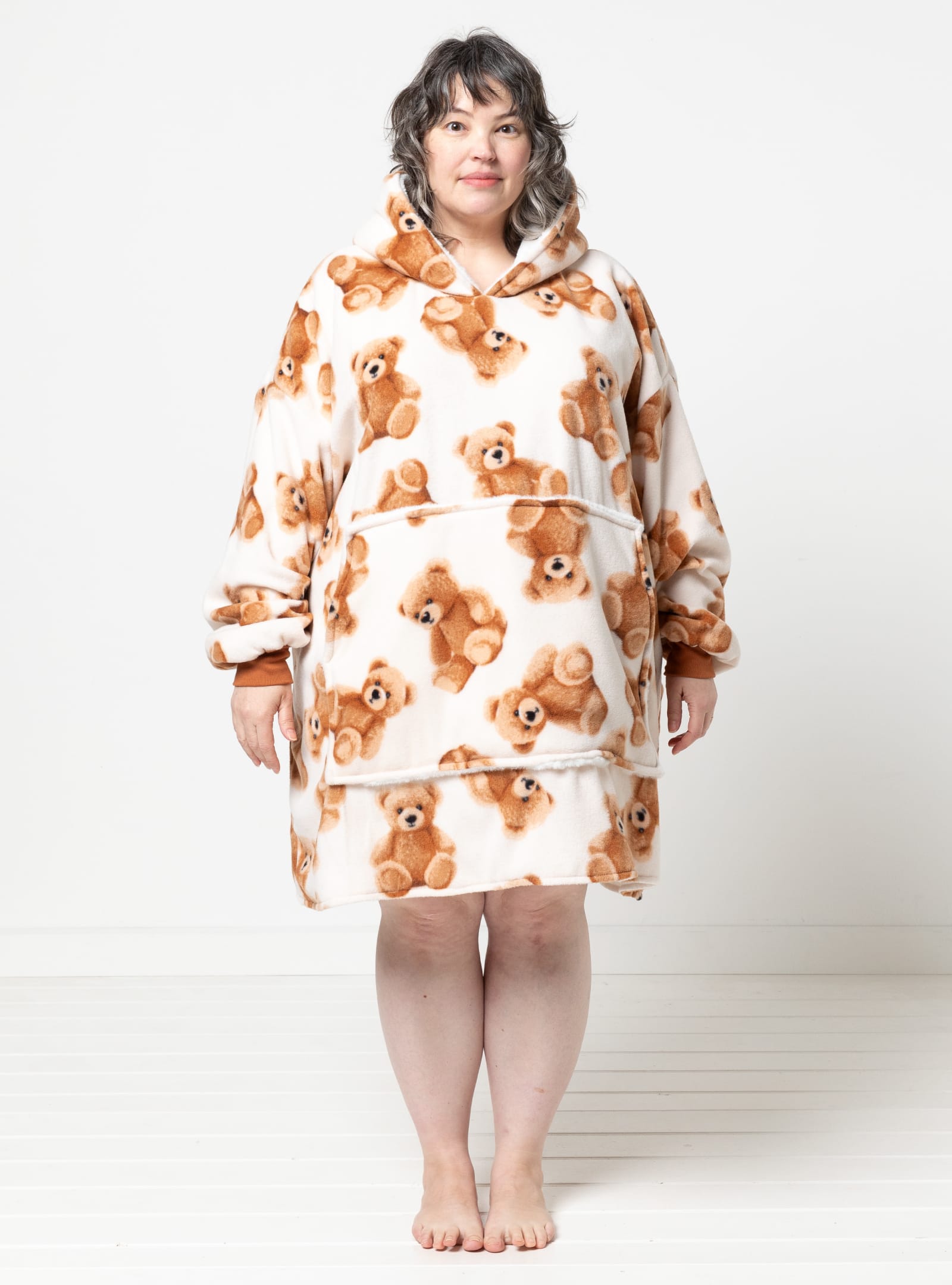 The Weekend Hoodie sewing pattern is an oversized hoodie-style wearable blanket with a lined hood and pocket, ribbed cuffs, and an unlined body for an easy make.