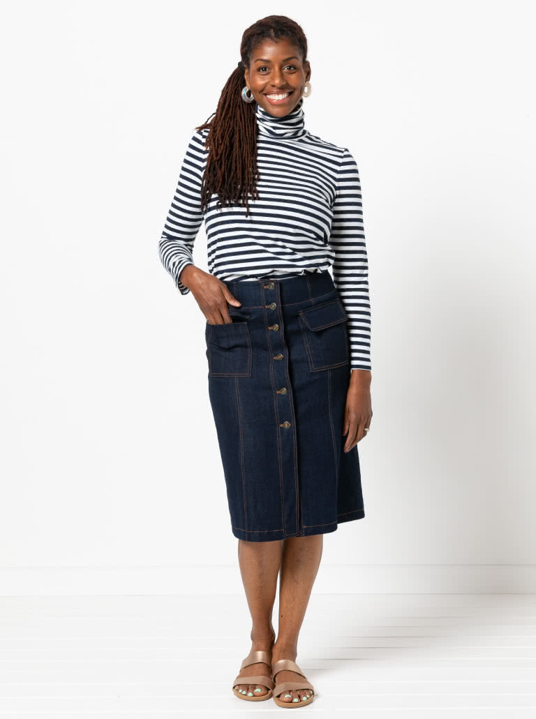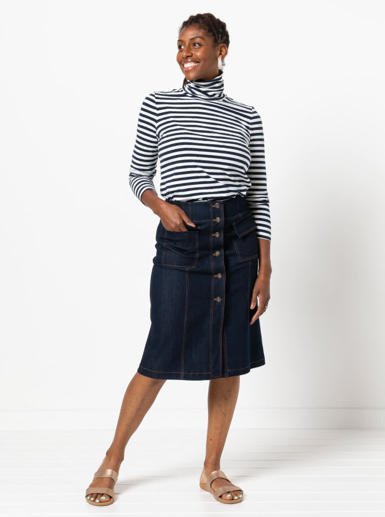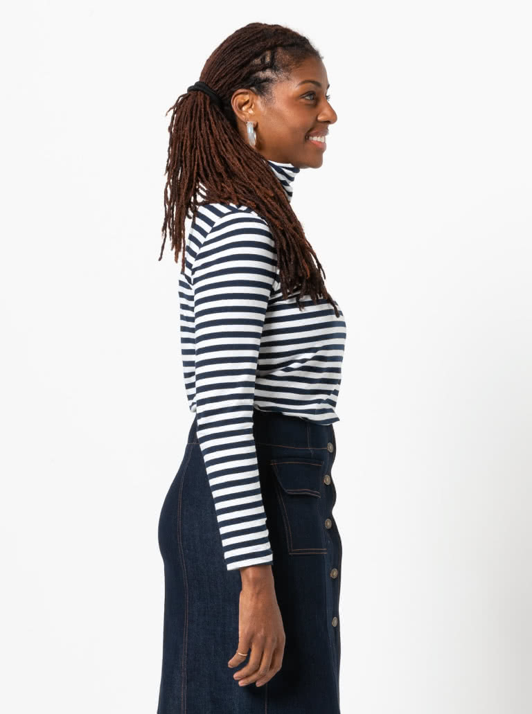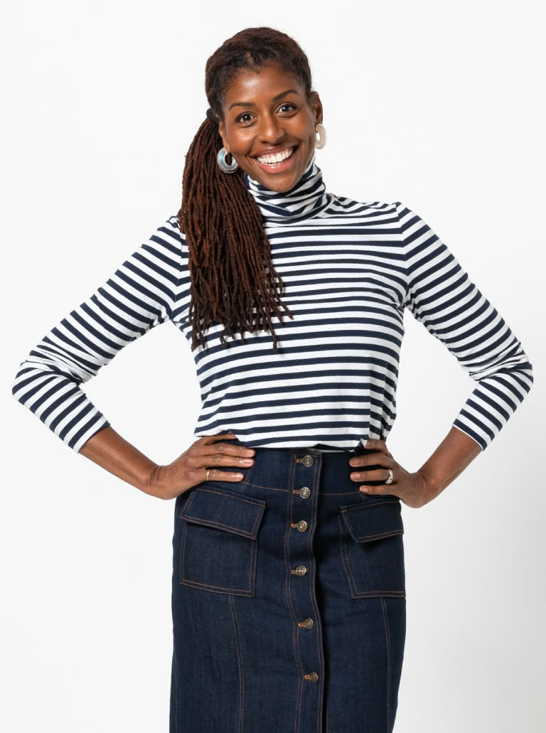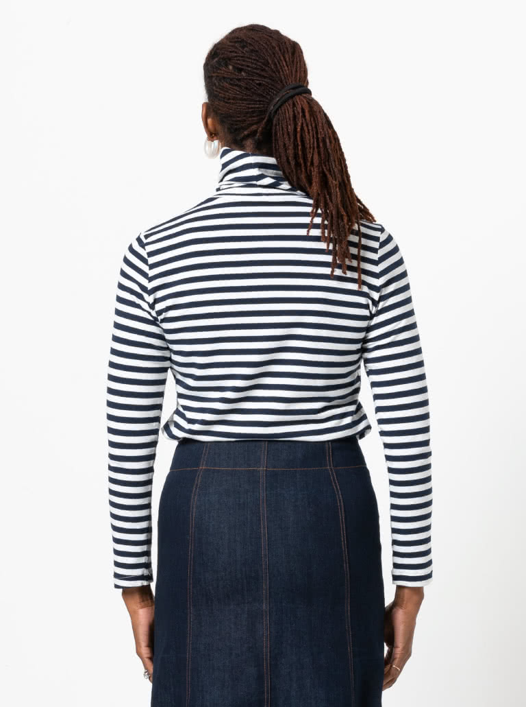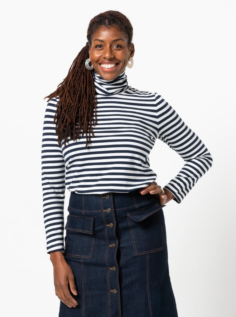 The Alexi Knit Top sewing pattern features a classic skivvy style with a cosy roll neck, long sleeves and a semi-fitted shape – perfect for layering or wearing on its own for a sleek, effortless look.
