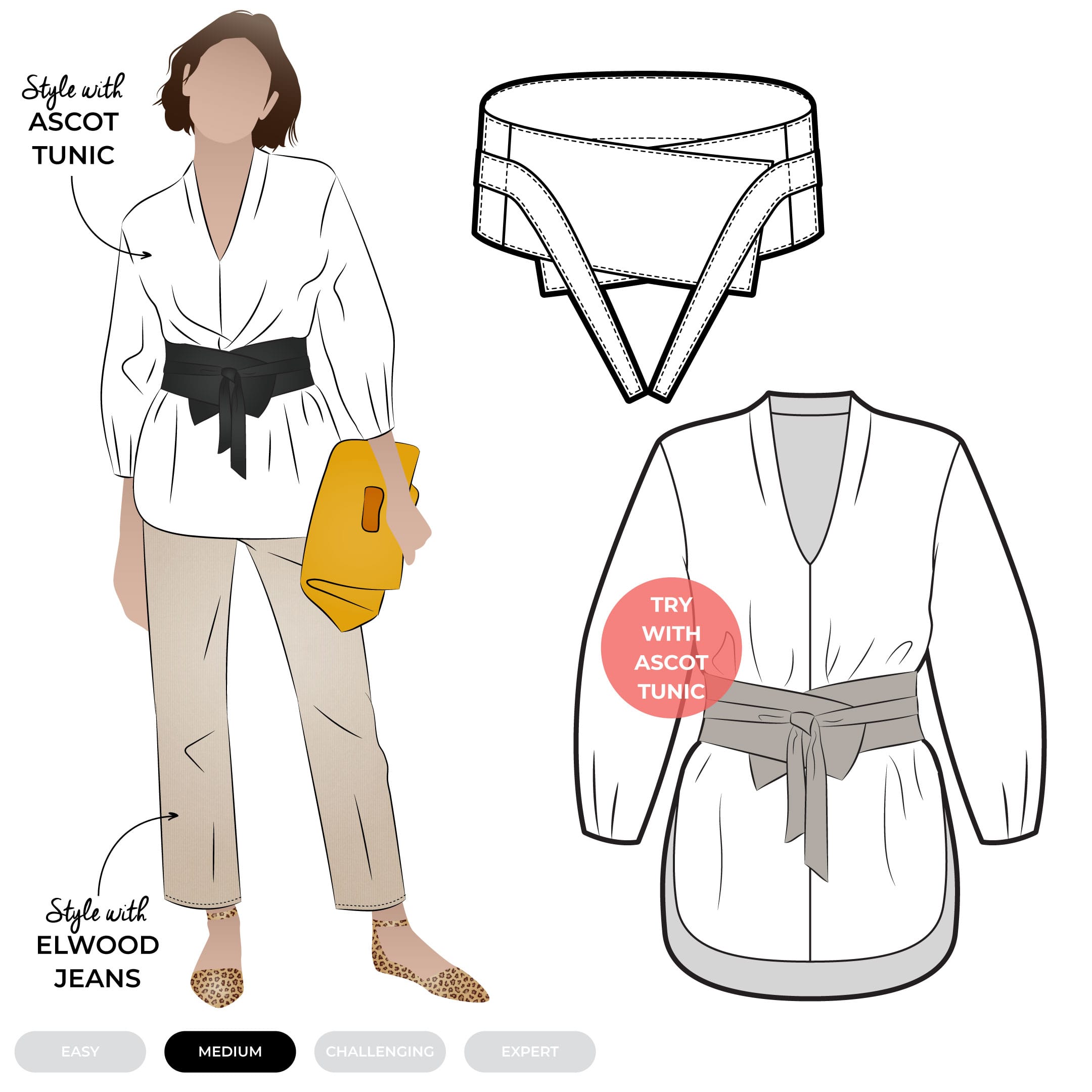 Ascot Belt is an Arc Archives style. Limited formats. Construction sheets are minimal, and a tutorial might not exist - for confident sewists who are up for a challenge.
