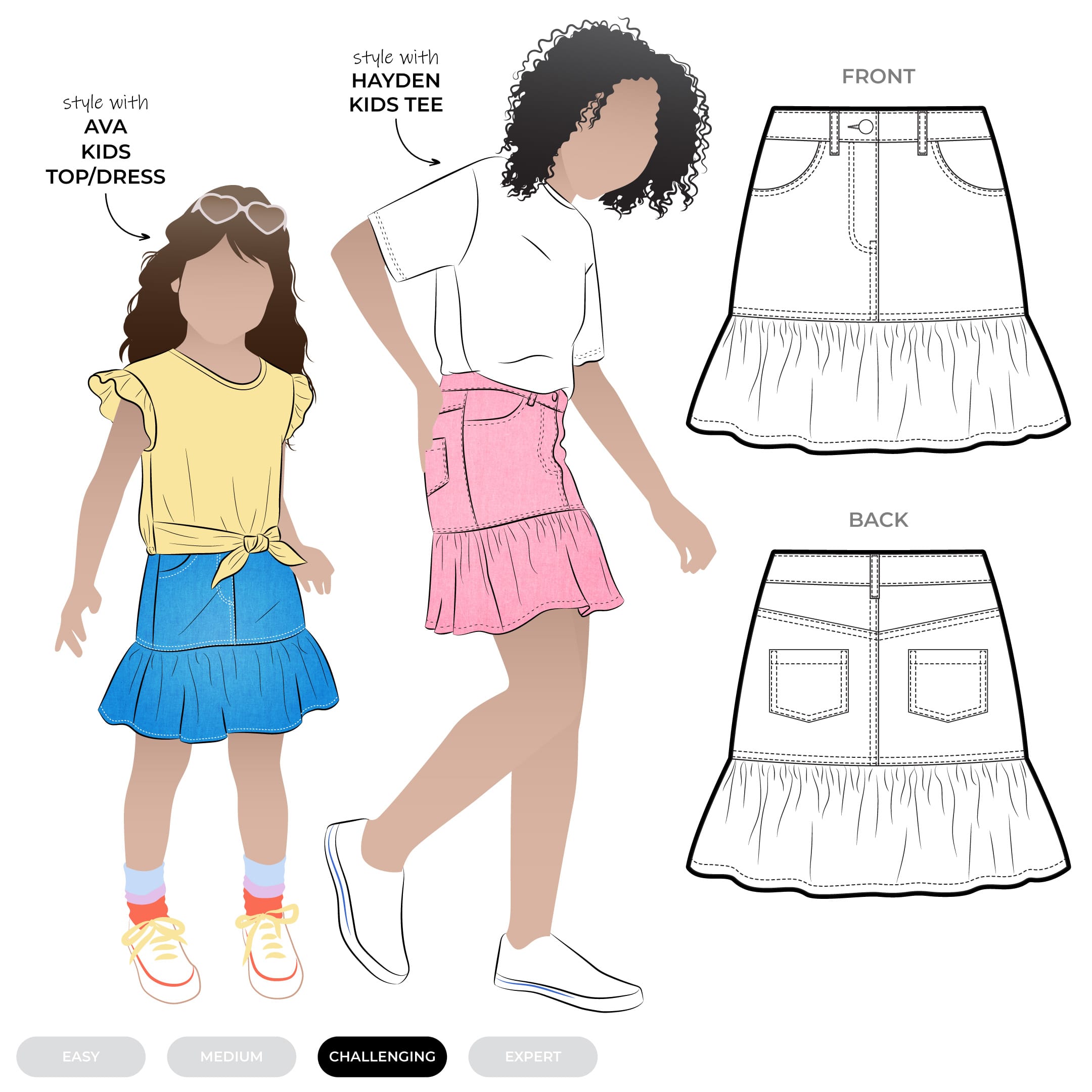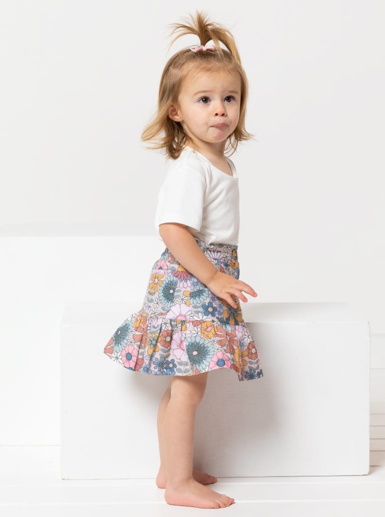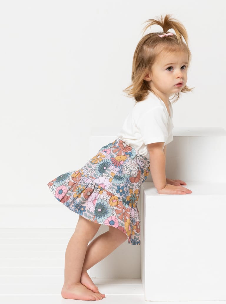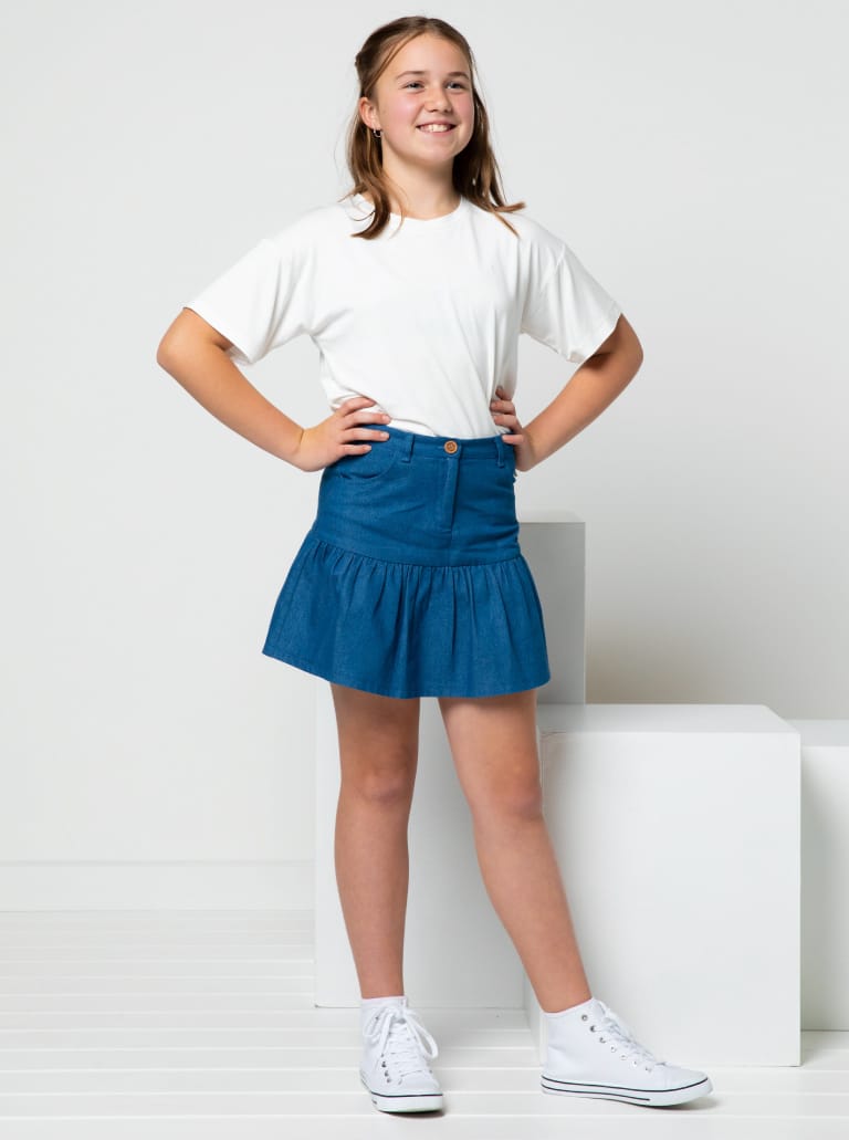The Etta Kids Skirt sewing pattern features a zip fly opening with front and back pockets, decorative stitching details, and a playful frill hem for added movement.