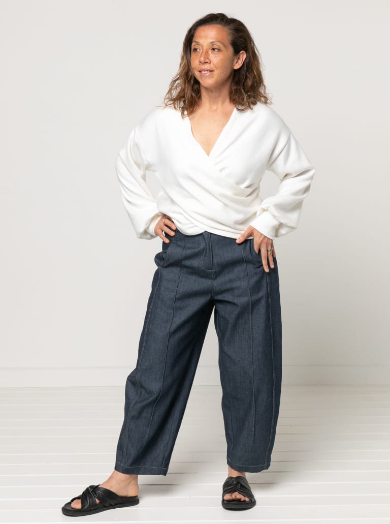 The Kira Knit Top sewing pattern features a draped style crossover jumper with dropped shoulders and full sleeves gathered into a cuff. Its plain back and high hip fit make it a comfortable and stylish choice, offering a generous fit that’s perfect for casual wear.