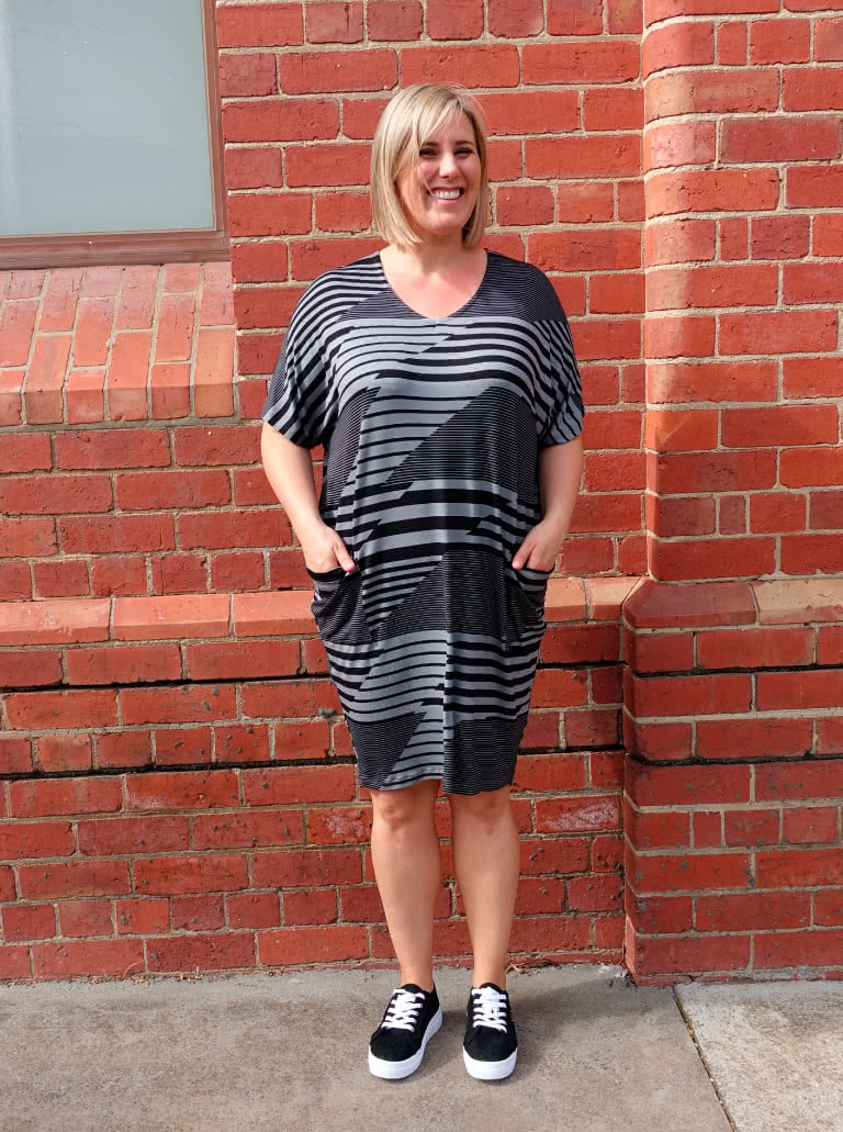 This is the perfect throw on dress with its slight cocoon shape, extended shoulder line, patch pockets and a shaped hemline.