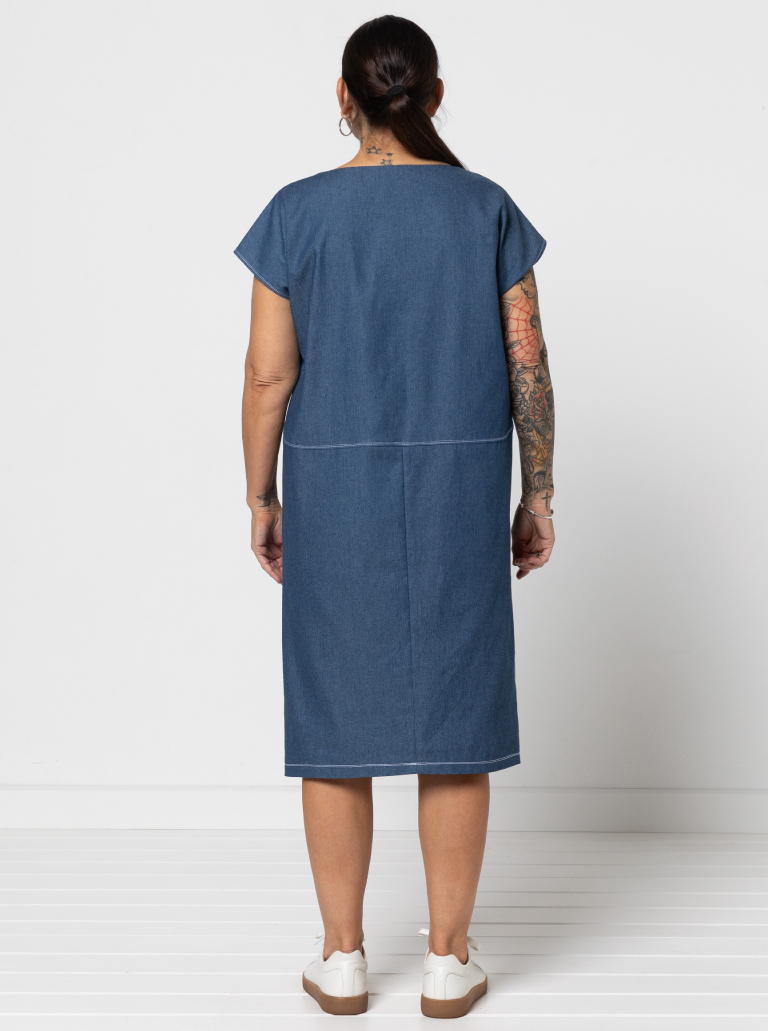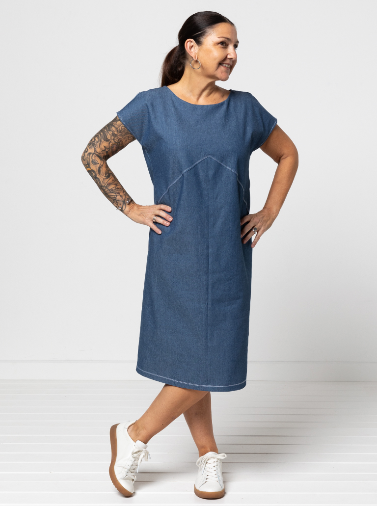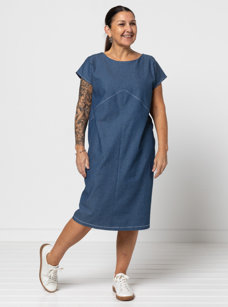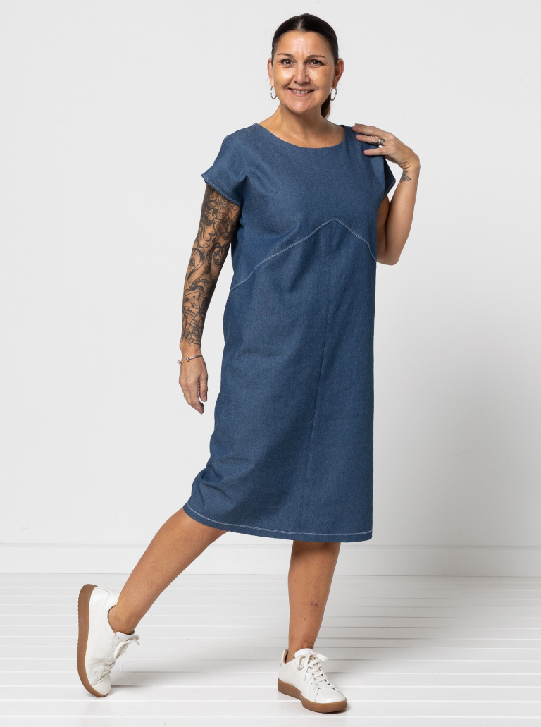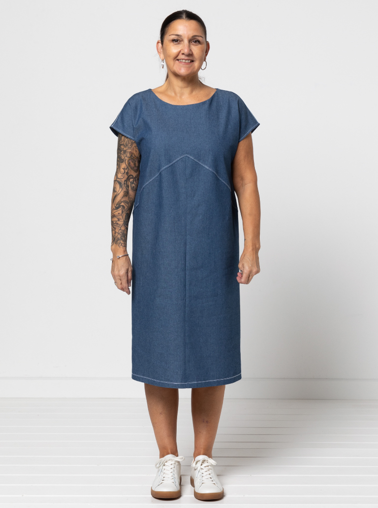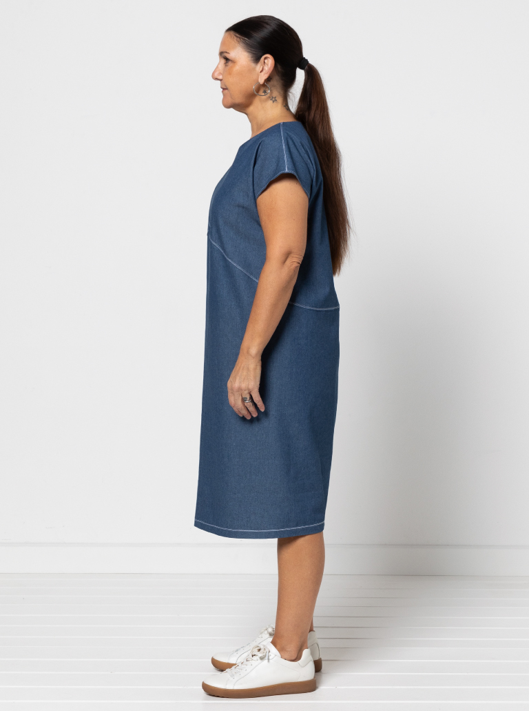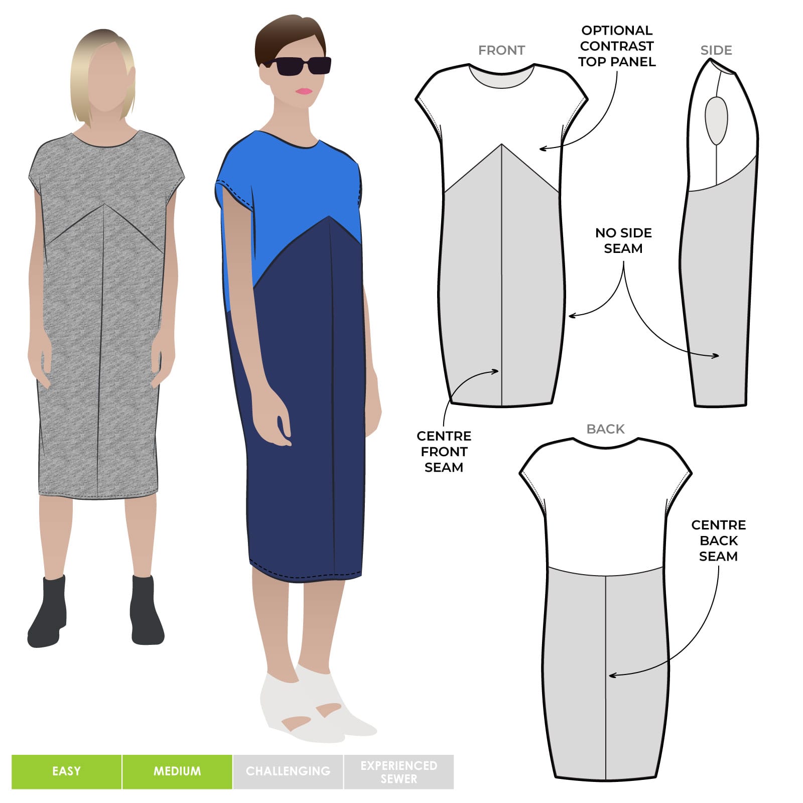 The Mila Designer Dress sewing pattern creates a simple pull-on dress with a slight cocoon shape and extended shoulder line for a modern fit. Designed at a versatile knee-length with a round neckline, it features an angled bodice seam-perfect for colour blocking. Mila is ideal for creating an easy, contemporary dress you’ll reach for again and again.