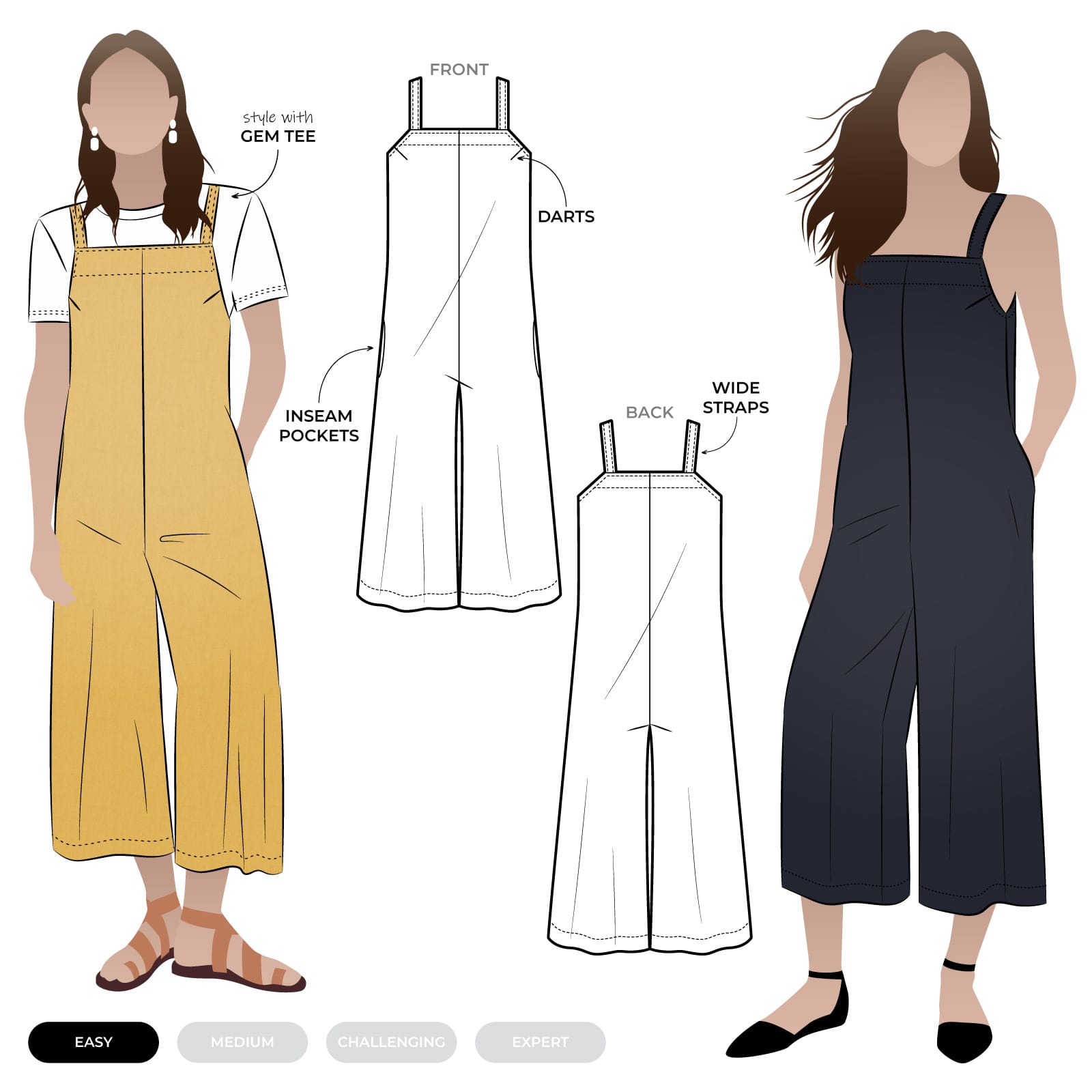 This all-seasons jumpsuit sewing pattern features a slip-on design, wide shoulder straps for comfort, wide legs and 7/8th length for a chic, relaxed silhouette, plus inseam pockets for a practical touch.