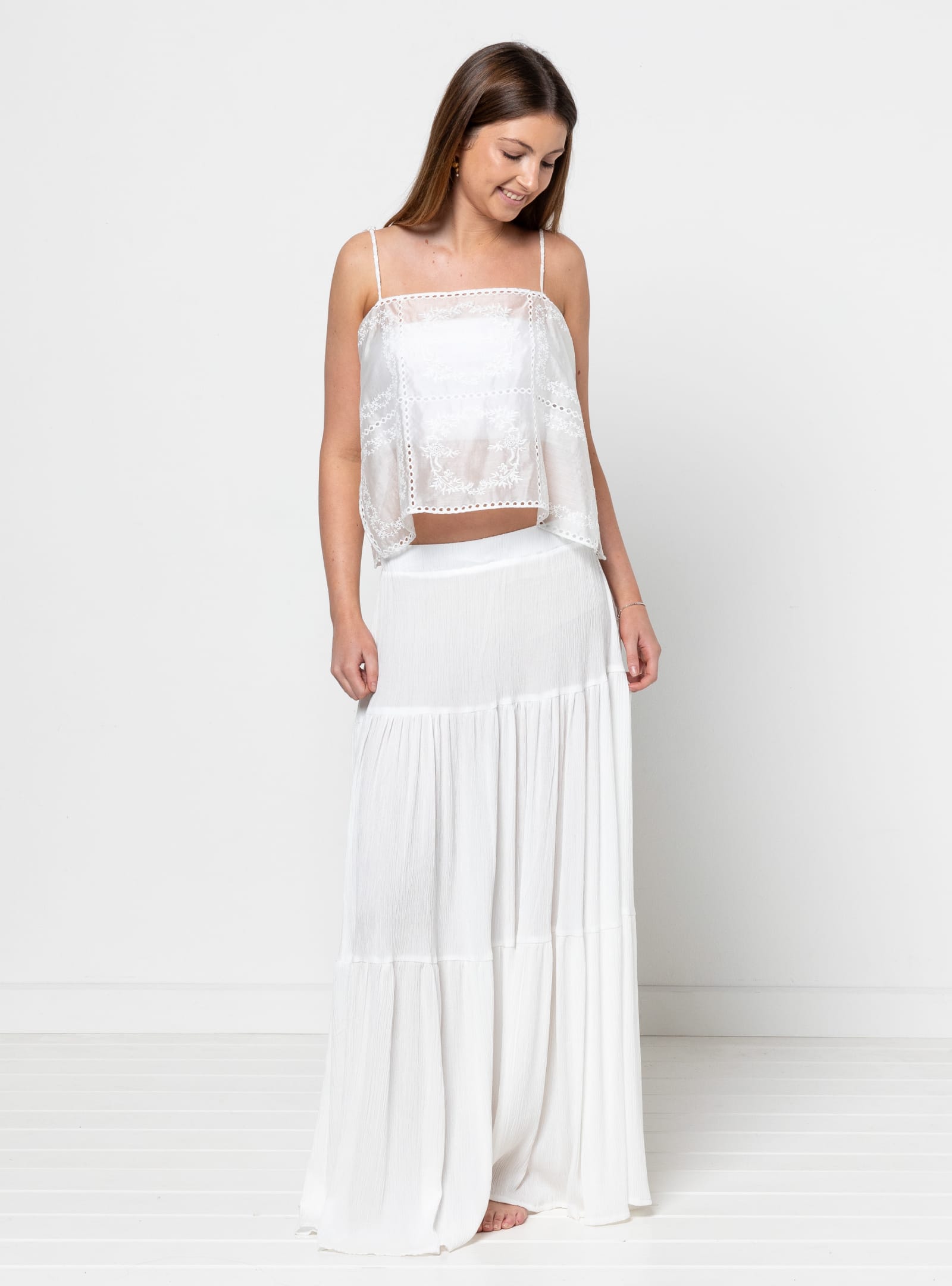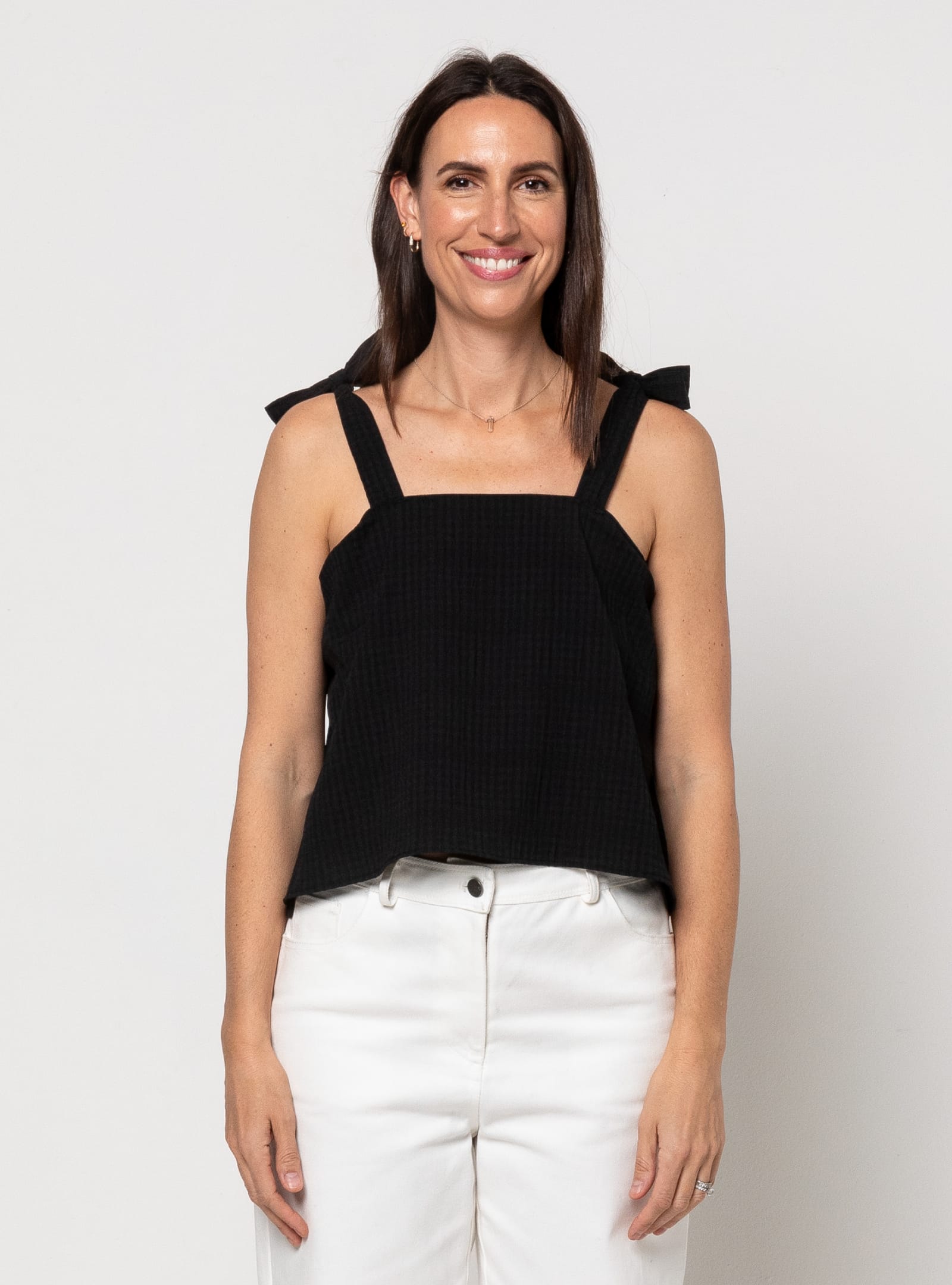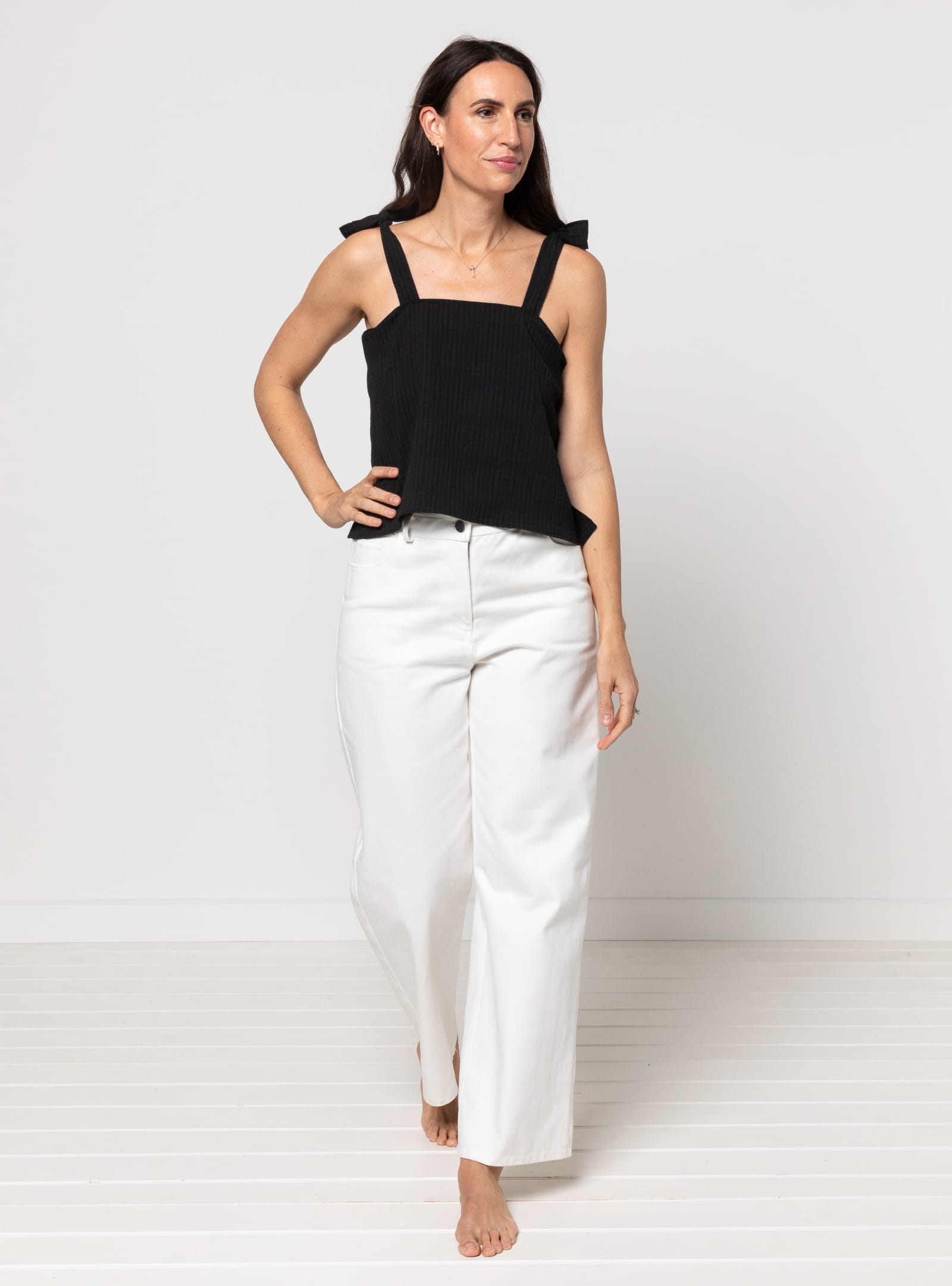 The Nica Woven Top sewing pattern creates a square-shaped boxy tee with short sleeves, a crew neck, and a dropped shoulder line. It features a high-low hem and side splits.
