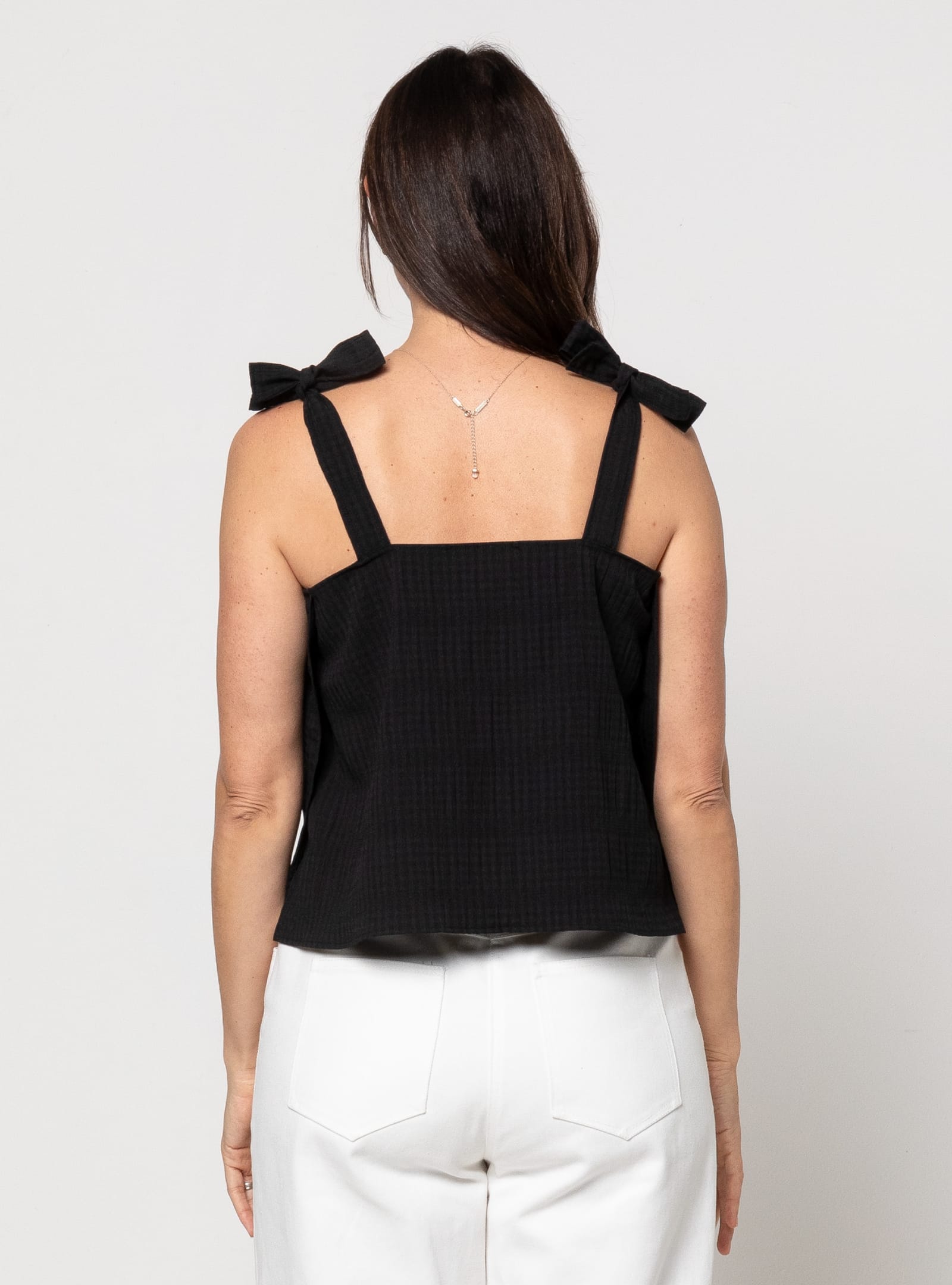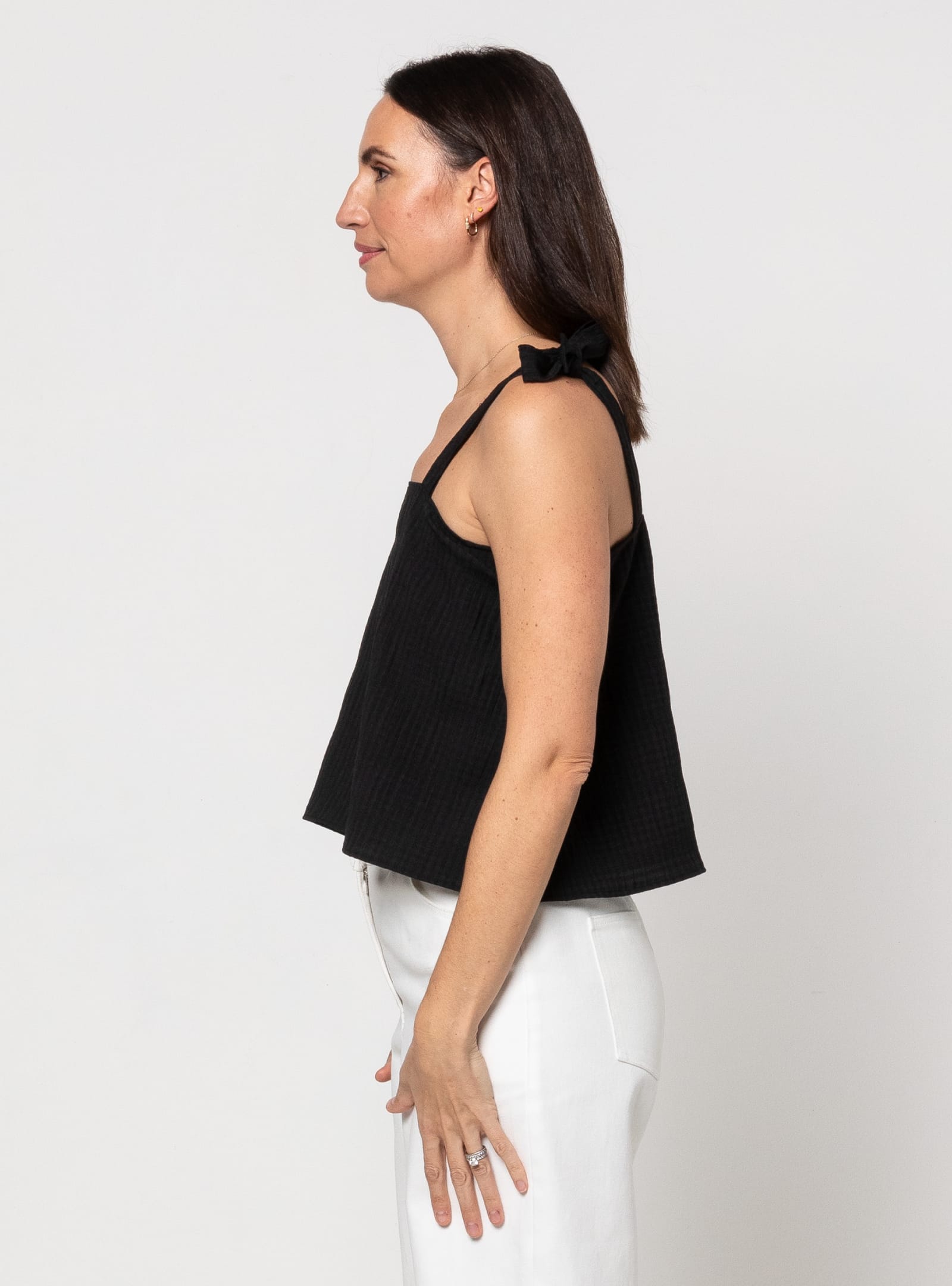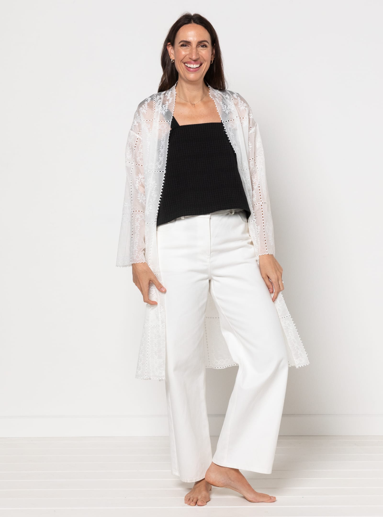 The Nica Woven Top sewing pattern creates a square-shaped boxy tee with short sleeves, a crew neck, and a dropped shoulder line. It features a high-low hem and side splits.