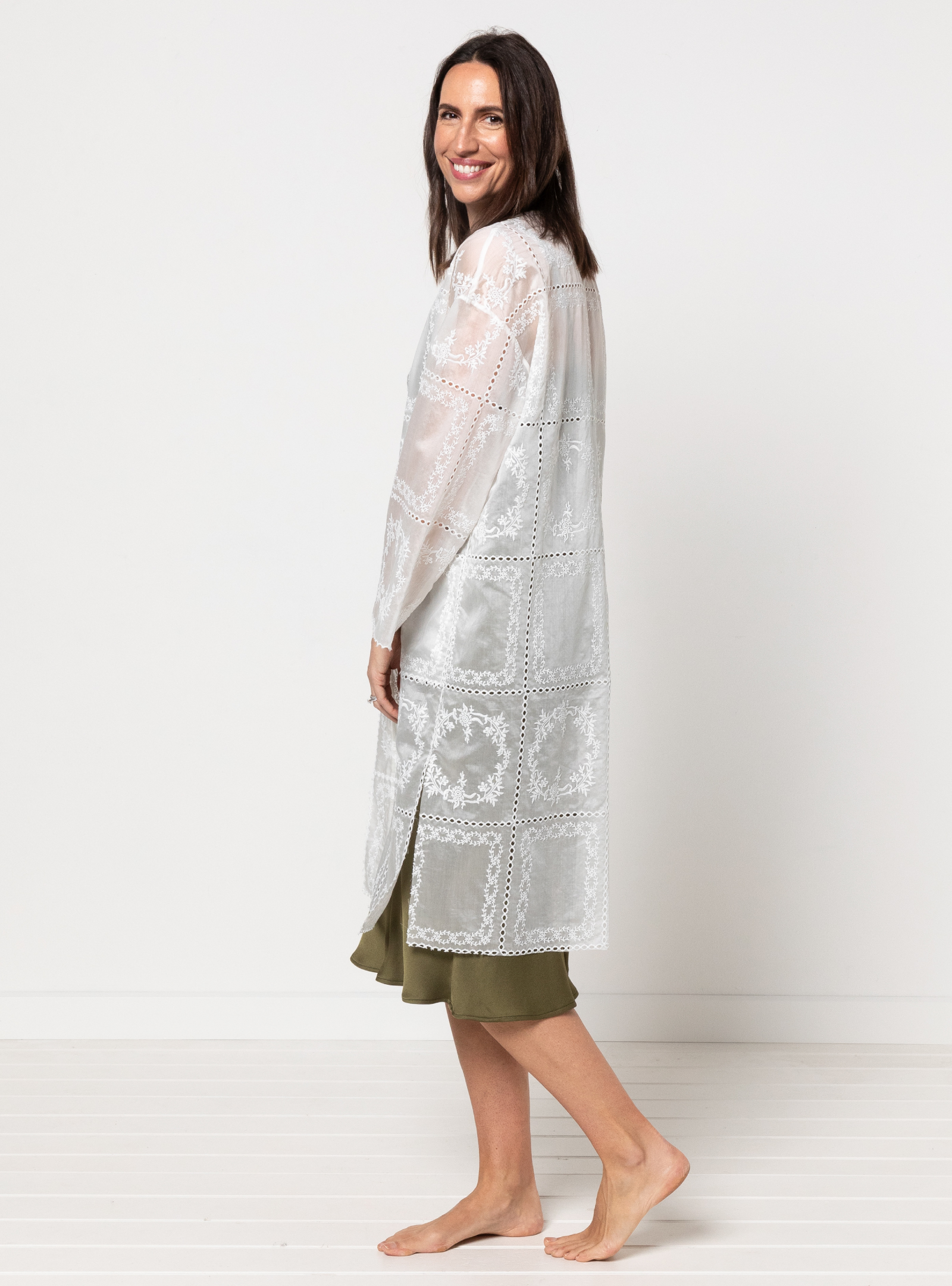 The Sigrid Knit Coat sewing pattern is a longline coat with an open front and folded band, full-length sleeves with wide cuffs, and practical patch pockets.