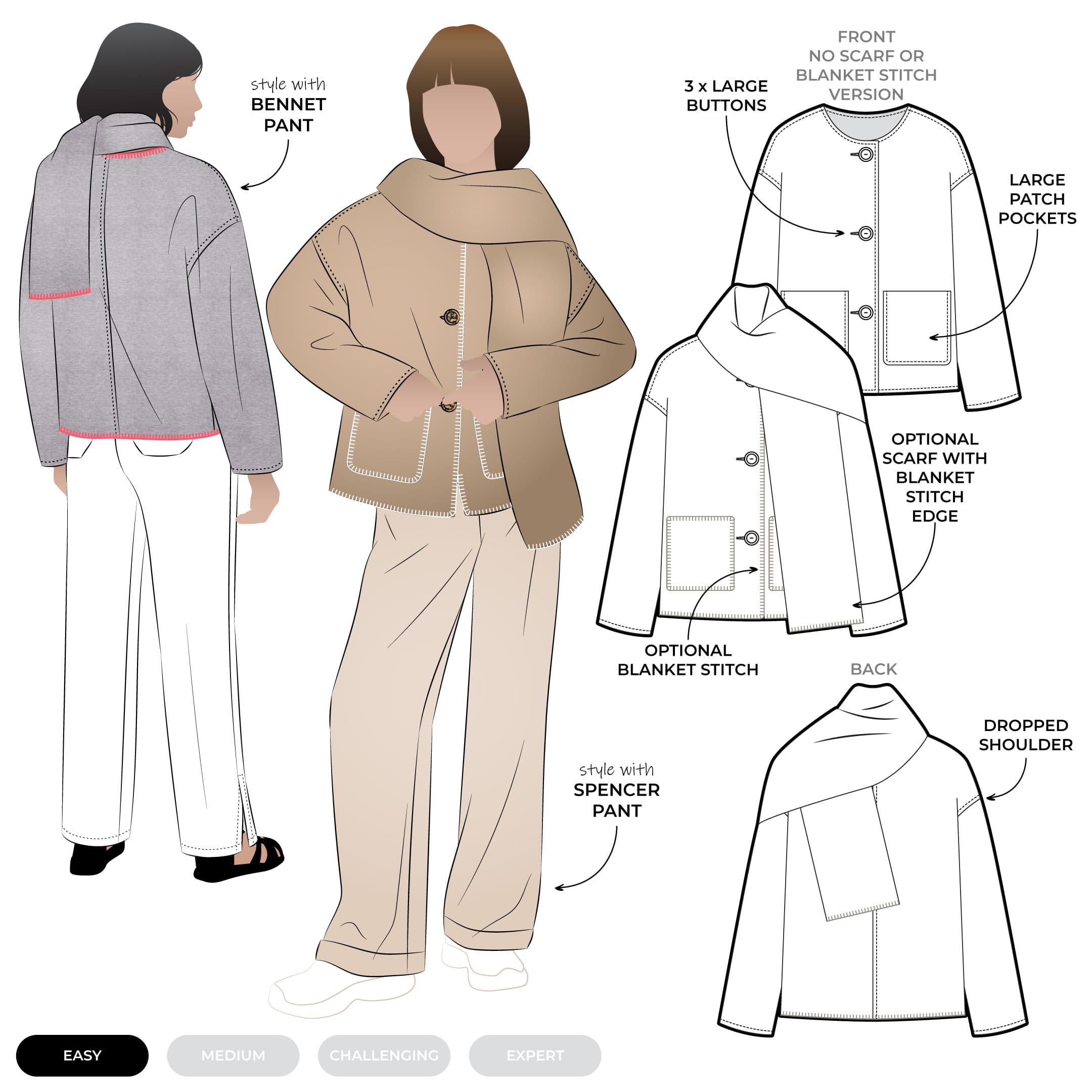 The Wren Jacket sewing pattern offers an effortlessly modern, square-shaped silhouette designed for easy layering and everyday wear. With its wide sleeves, dropped shoulder line, and clean round neckline with facing, this unlined jacket sits neatly at the high hip for a relaxed yet considered look. Optional patch pockets, scarf, and a decorative blanket-stitch edge finish allow you to personalise your make, creating a versatile jacket you"ll reach for season after season.